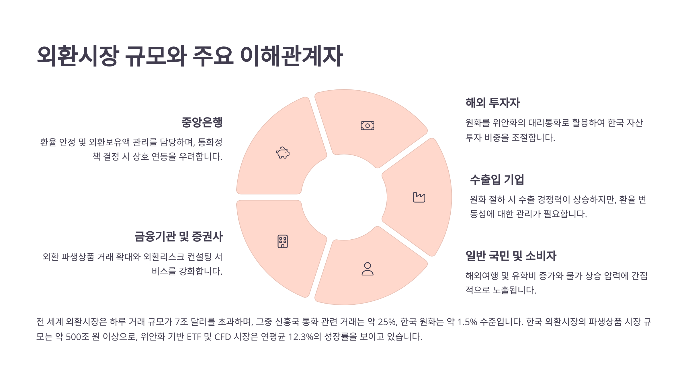 전 세계 외환시장은 하루 거래 규모가 7조 달러를 초과합니다. 그중 신흥국 통화 관련 거래는 약 25%, 한국 원화는 약 1.5% 수준입니다.