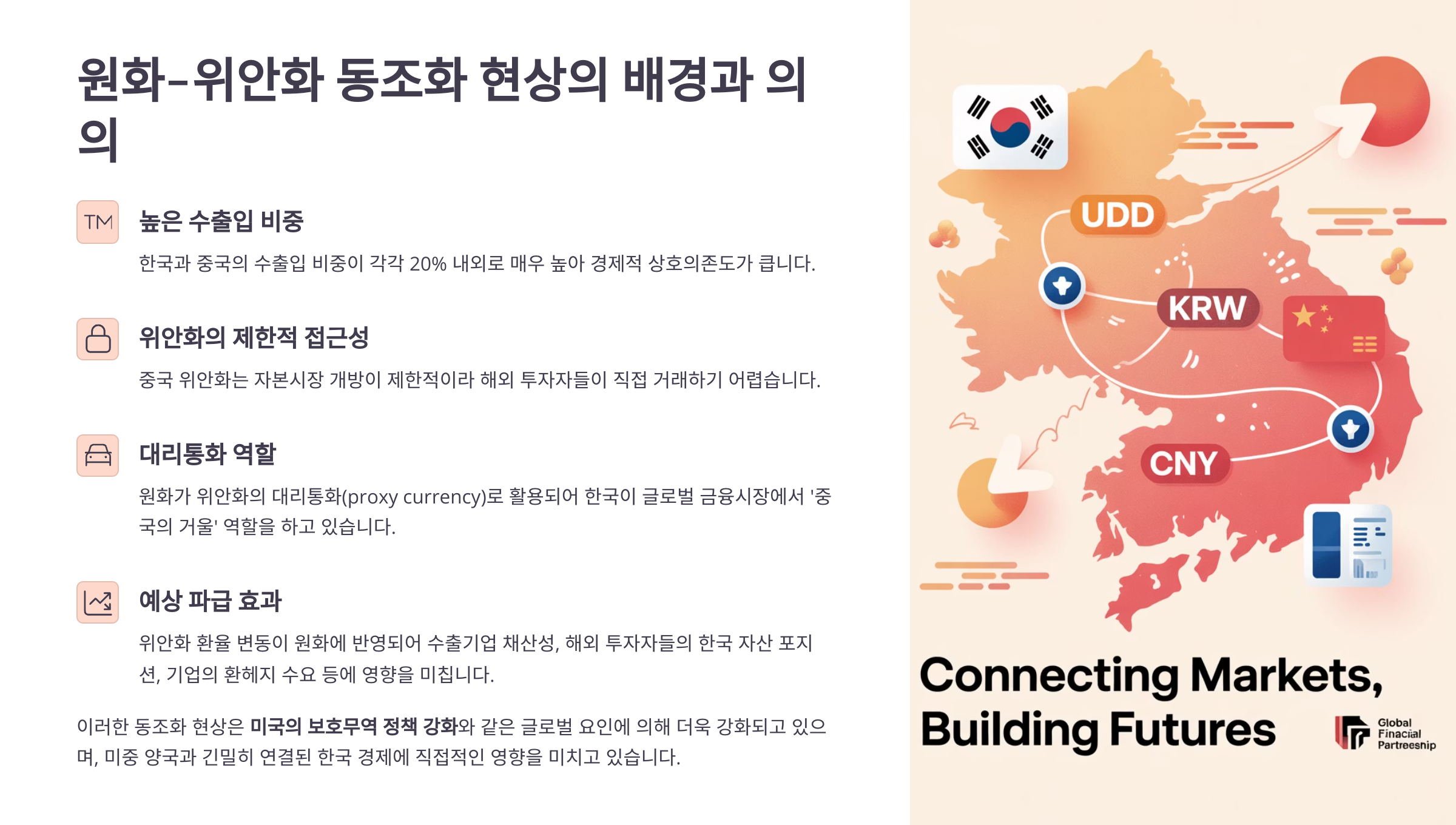 정부의 환리스크 관리 정책과 자본시장 개방 조정 전략이 이 구조를 결정짓고 있으며, 향후 한·중 간 금융 협력 확대가 이 동조화 구조를 더욱 강화할 수 있습니다.