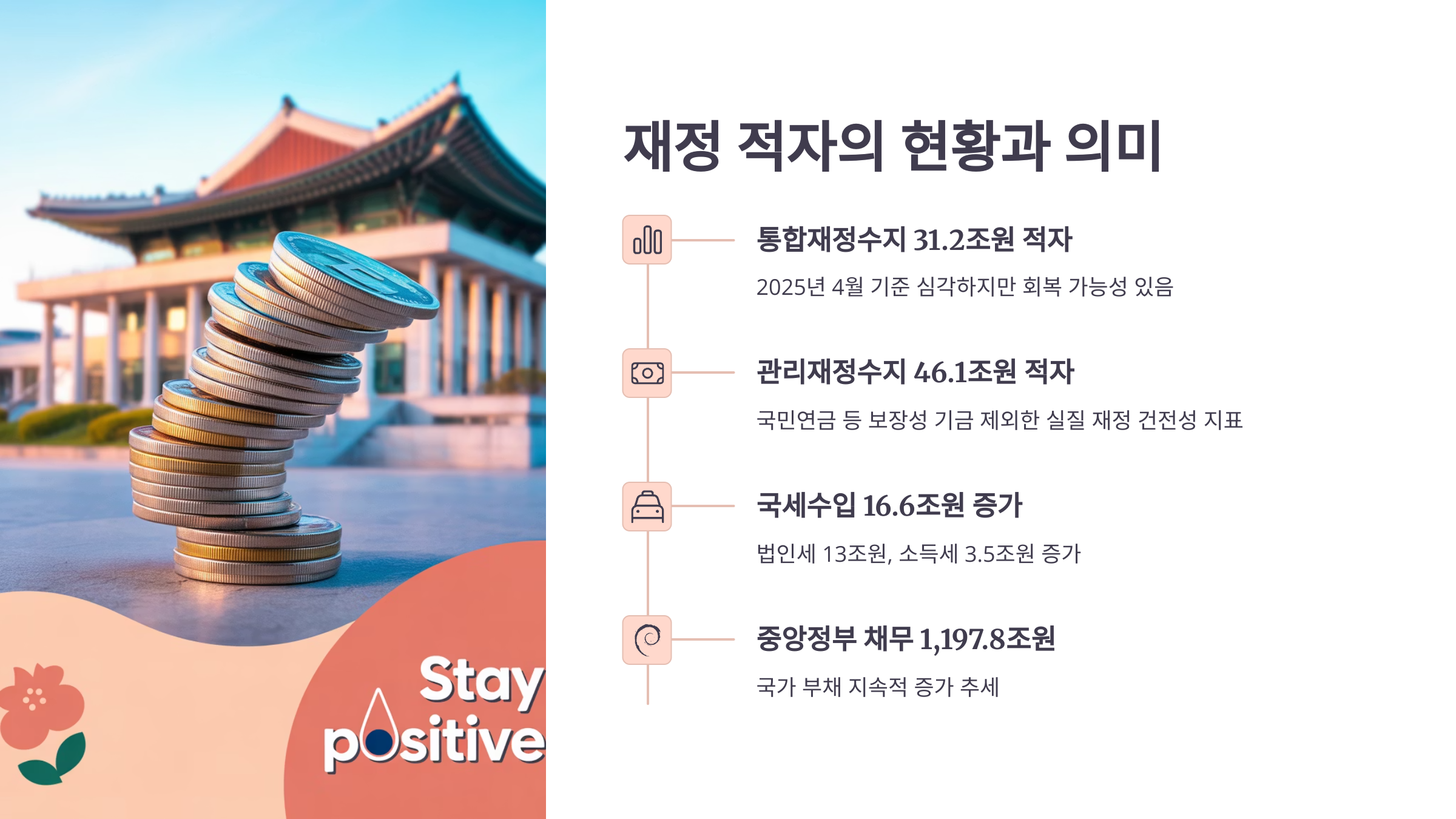 한 달 벌어 한 달 살기도 빠듯한 요즘, 나라살림 적자라는 뉴스는 먼 이야기 같지만 사실 우리 삶에 직결된 문제입니다. 특히 '재정적자'라는 단어는 주식시장부터 금리, 세금까지 전방위로 영향을 미치죠. 최근 발표된 기획재정부의 자료에 따르면 2025년 1~4월 누계 적자가 46조1000억 원, 역대 세 번째 규모로 나타났습니다.