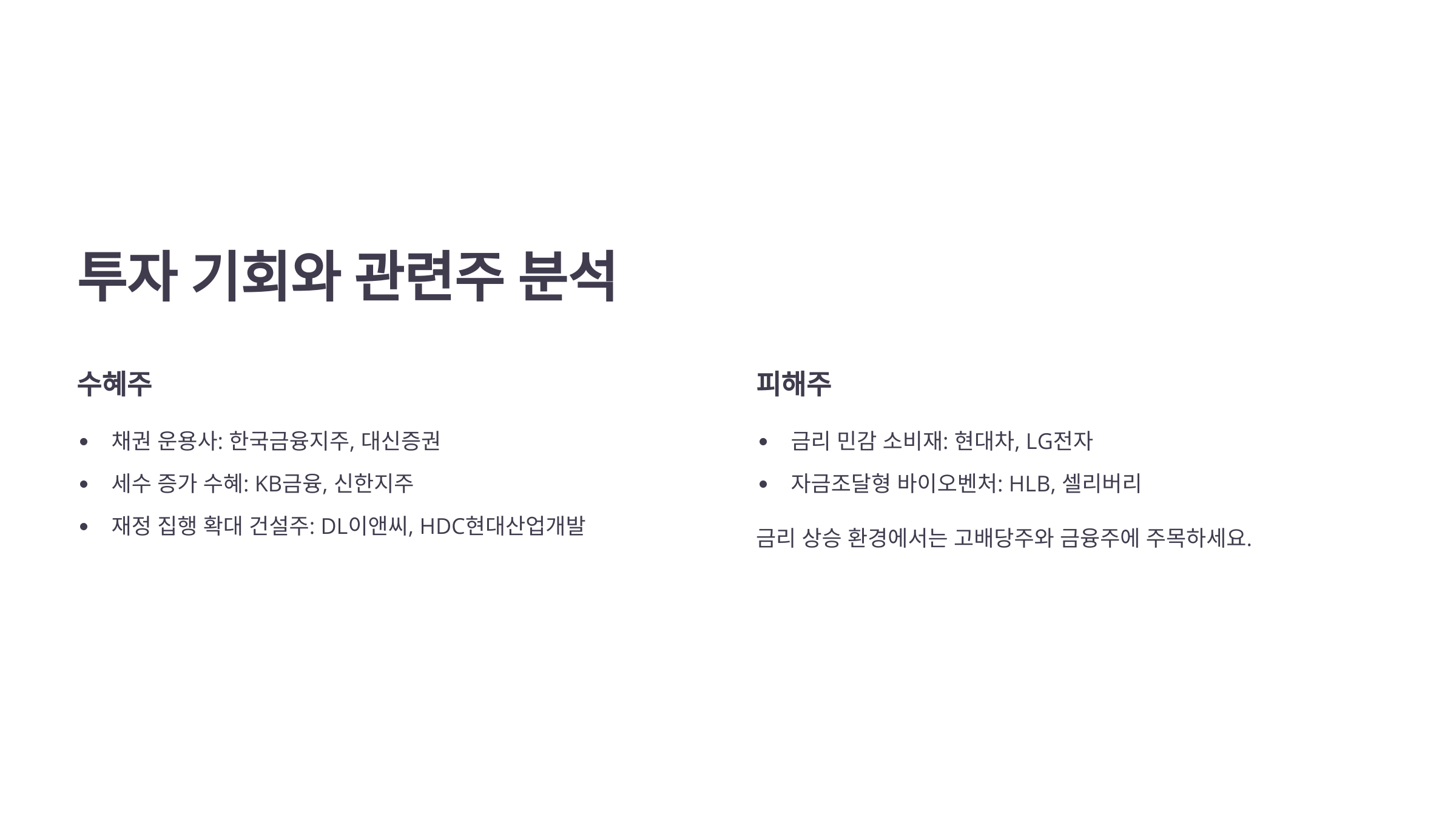 - 금리 민감 소비재: 현대차, LG전자 등 고관여 소비재