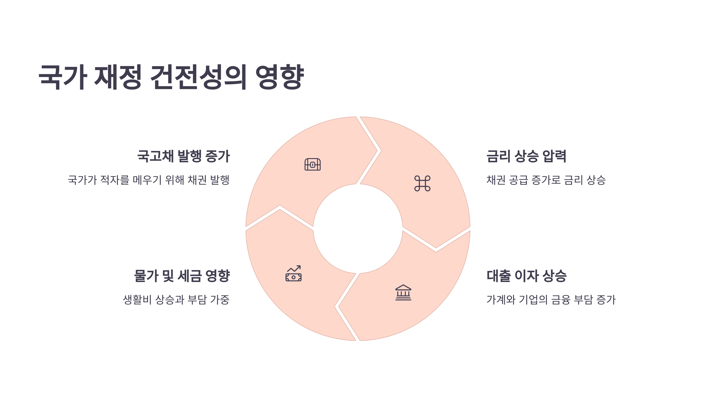 국가가 적자를 메우기 위해 채권을 발행하면, 시장에 공급이 증가해 채권 가격은 하락하고, 금리는 상승하게 됩니다. 이는 곧: