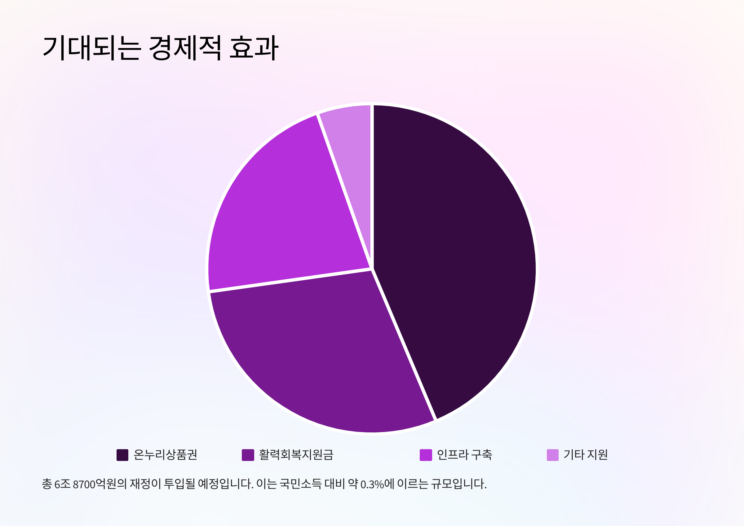 재정 규모가 추경 전보다 약 4조원 확대된 가운데, 온누리상품권과 지원금까지 합산하면 최대 6조8700억원 수준의 재정 투입이 예상되며, 이는 연간 국민소득 대비 약 0.3%에 이르는 지출입니다.