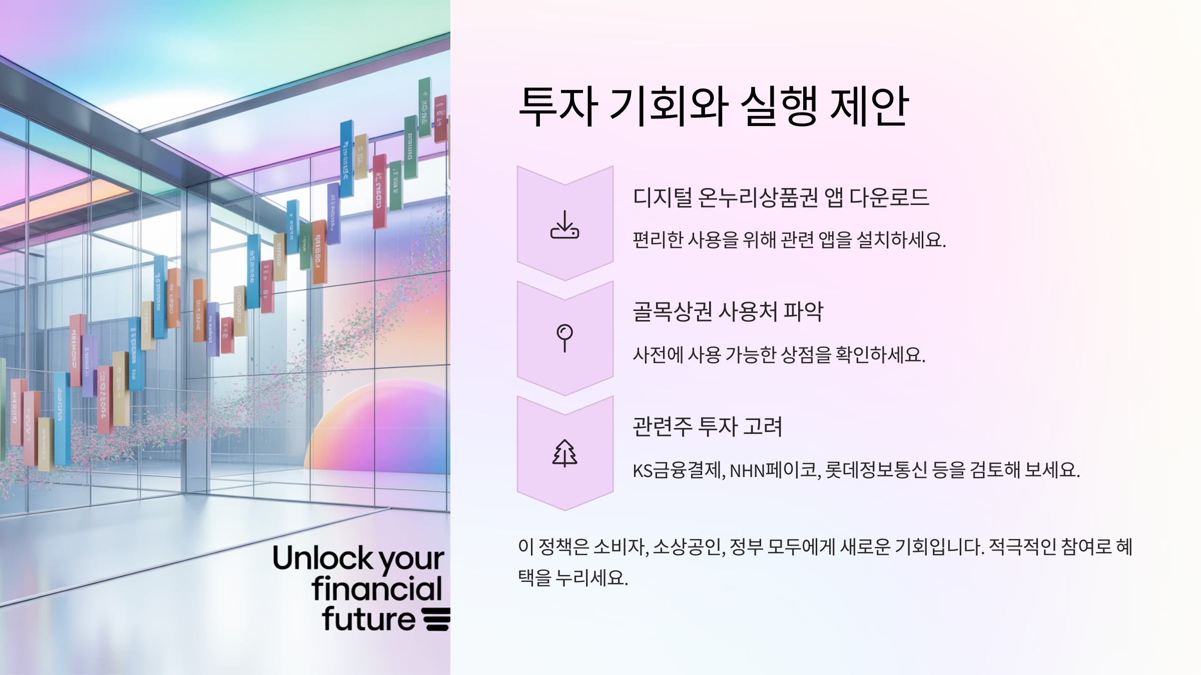 | 수혜주 | KS금융결제(지역화폐 인프라), NHN페이코(지역 디지털결제), 롯데정보통신(전통시장 스마트 솔루션) | 디지털 온누리상품권 확대 수혜 예상 |