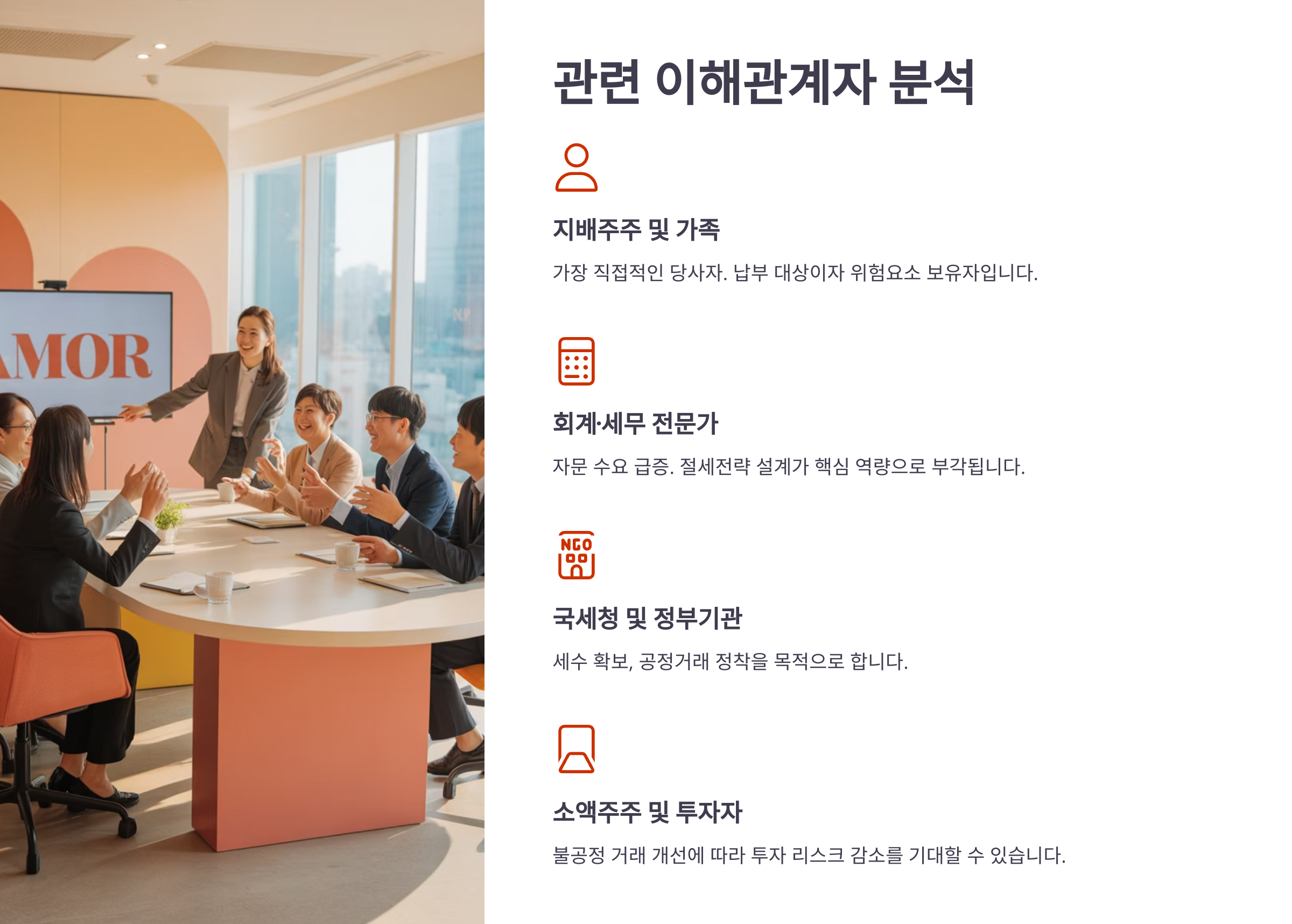 - 지배주주 및 가족: 가장 직접적인 당사자. 납부 대상이자 위험요소 보유자.