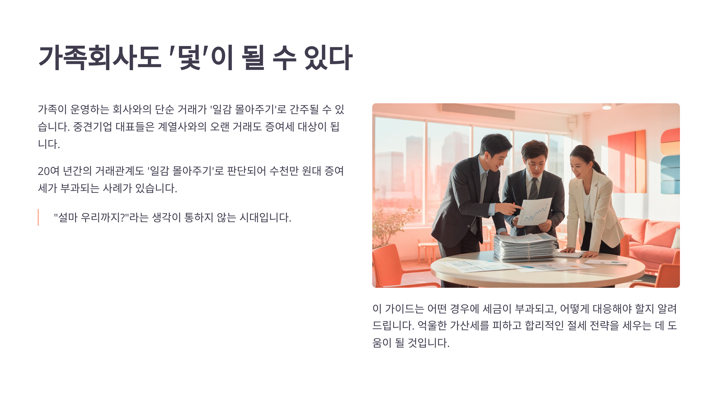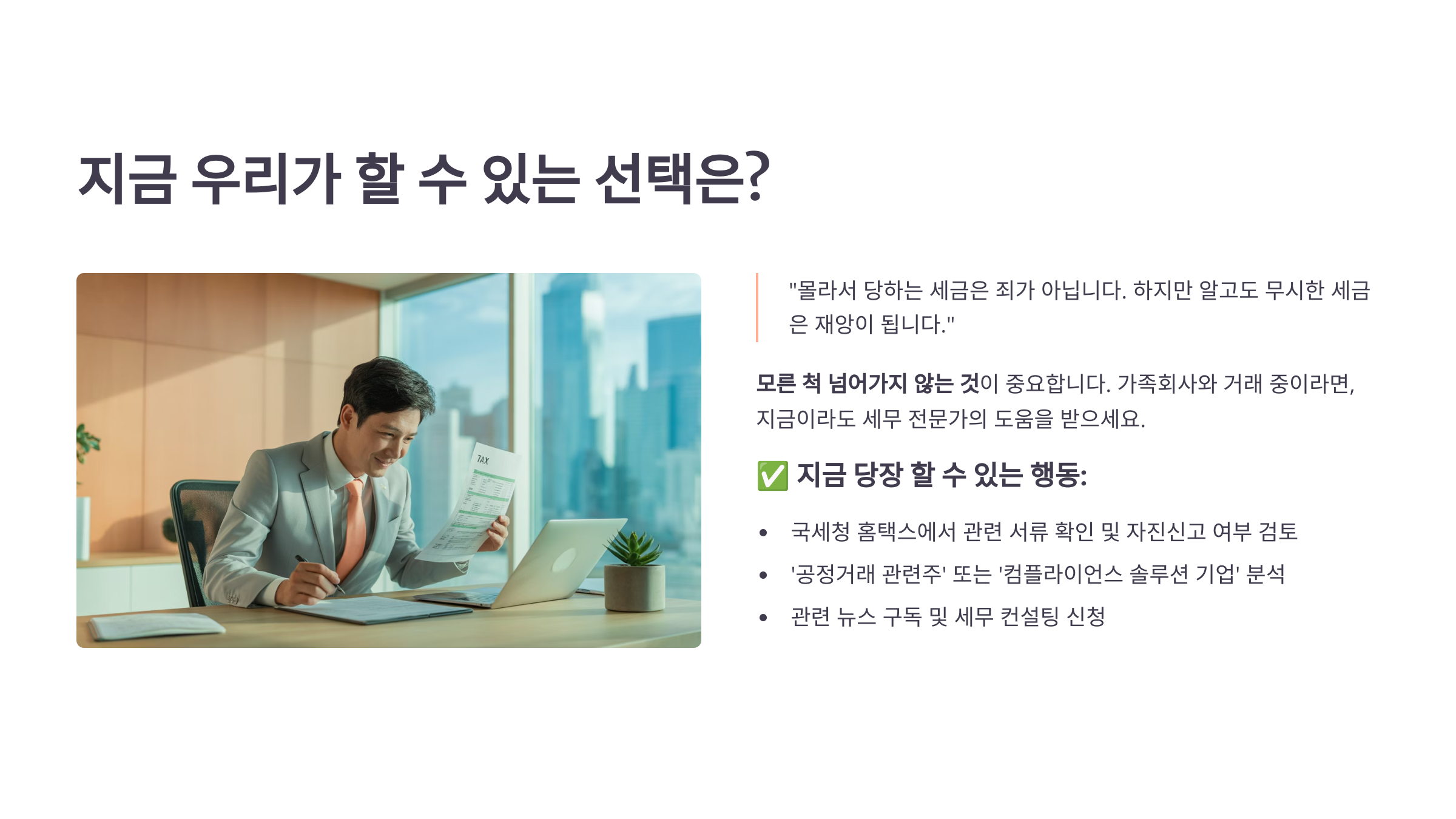 이제 중요한 것은 ‘모른 척 넘어가지 않는 것’입니다. 만약 가족회사와 거래 중이라면, 지금이라도 세무 전문가의 도움을 받아야 합니다.
