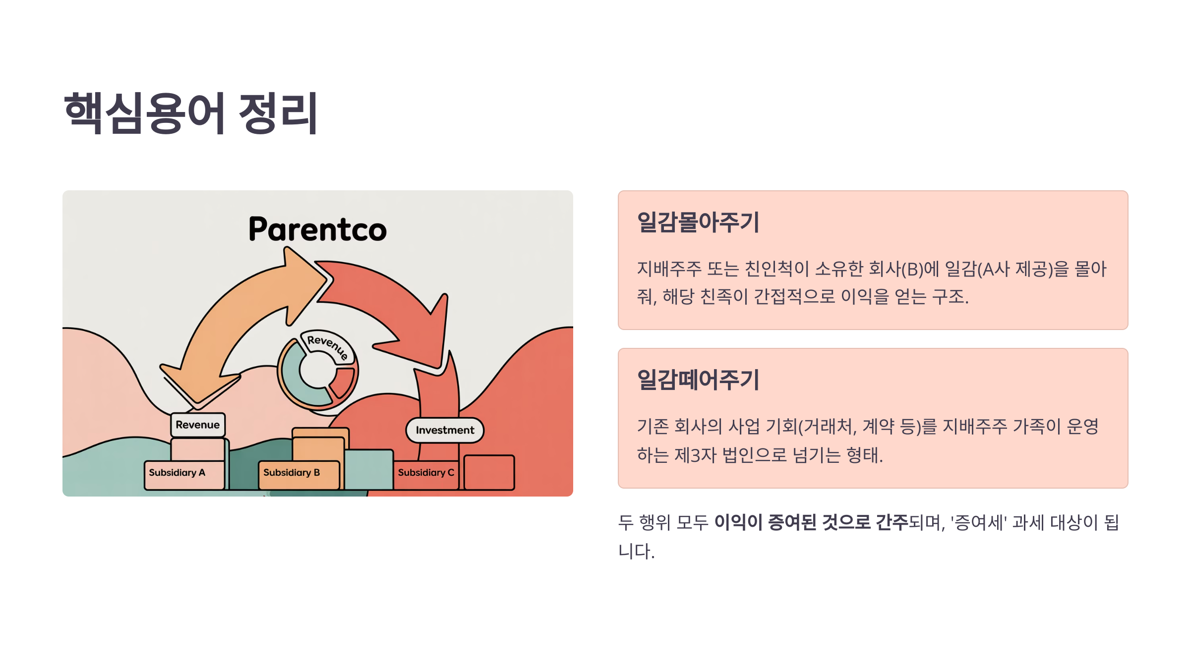 - 일감떼어주기: 기존 회사의 사업 기회(거래처, 계약 등)를 지배주주 가족이 운영하는 제3자 법인으로 넘기는 형태.