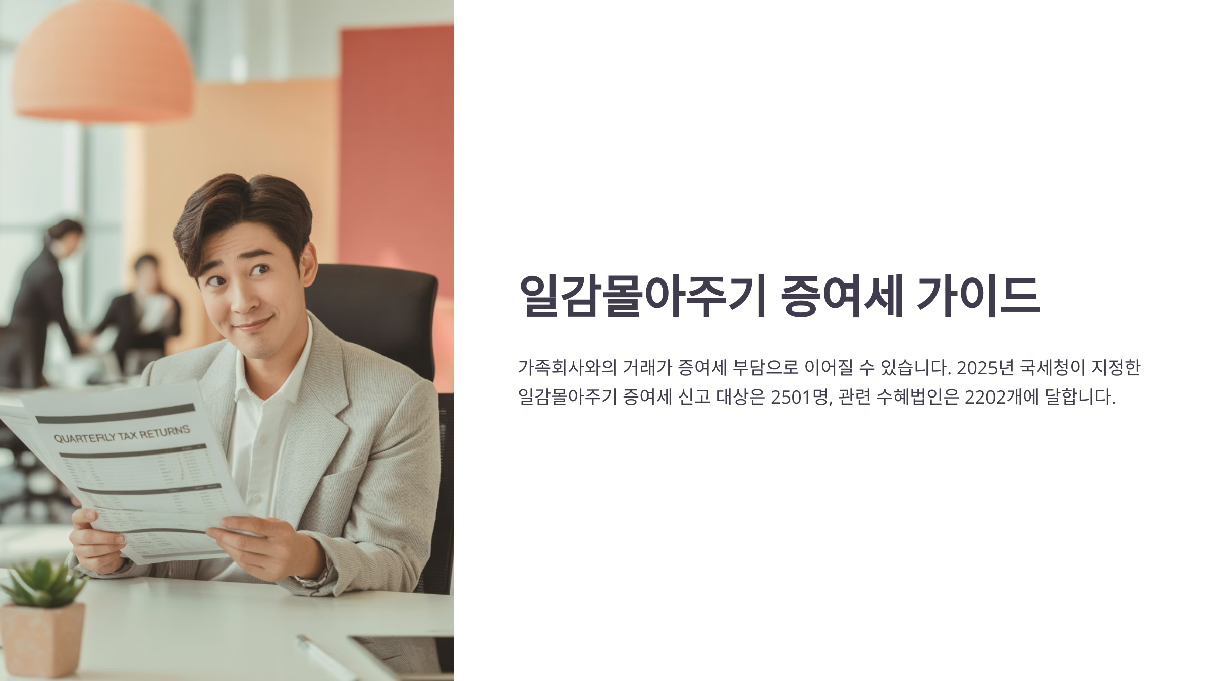2025년 6월, 국세청이 밝힌 ‘일감몰아주기·일감떼어주기 증여세’ 신고 대상은 무려 2501명, 관련 수혜법인만 2202개에 달합니다. 이 글은 ‘어떤 경우에 세금이 부과되고, 어떻게 대응해야 할지’를 알려드리기 위해 준비했습니다. 억울한 가산세를 피하고 합리적인 절세 전략을 세우는 데 실질적인 도움이 될 것입니다.