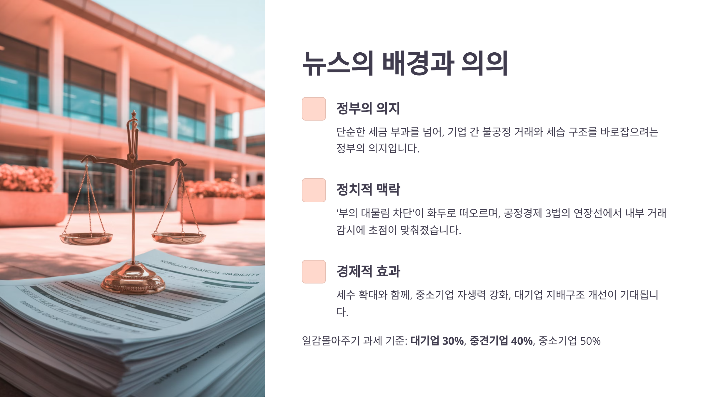 경제적으로는 세수 확대와 함께, 중소기업의 자생력 강화, 대기업의 지배구조 개선이 기대됩니다.