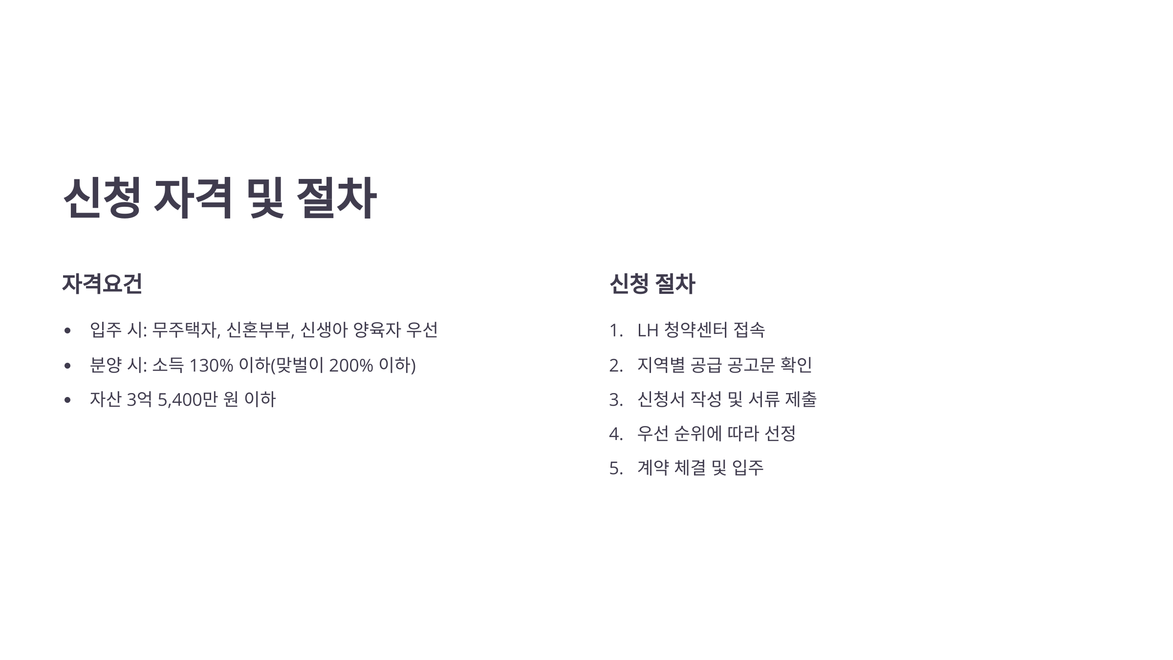 | 필요 서류 | 무주택서약서, 소득증빙, 가족관계증명서 | 분양 시점 기준 자격 중요 |