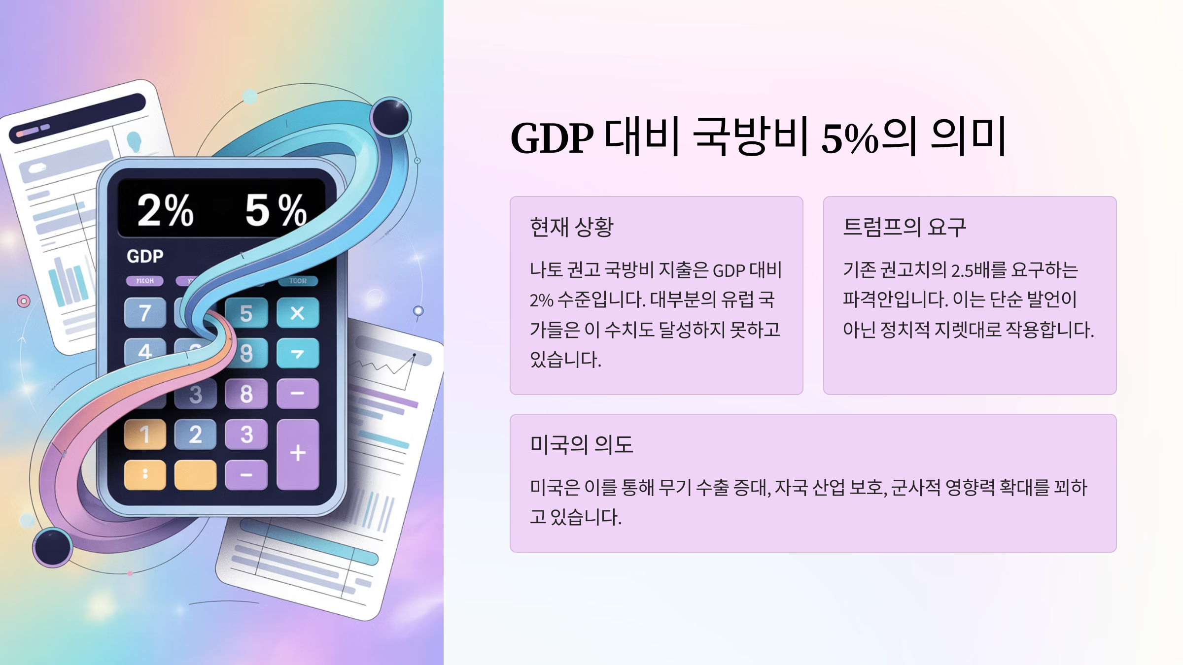 트럼프의 5% 발언은 기존 권고치의 2.5배를 요구하는 파격안으로, 이는 단순 발언이 아니라 정치적 무기로 사용되는 지렛대입니다. 미국은 이를 통해 무기 수출 증대, 자국 산업 보호, 군사적 영향력 확대를 꾀하고 있습니다.