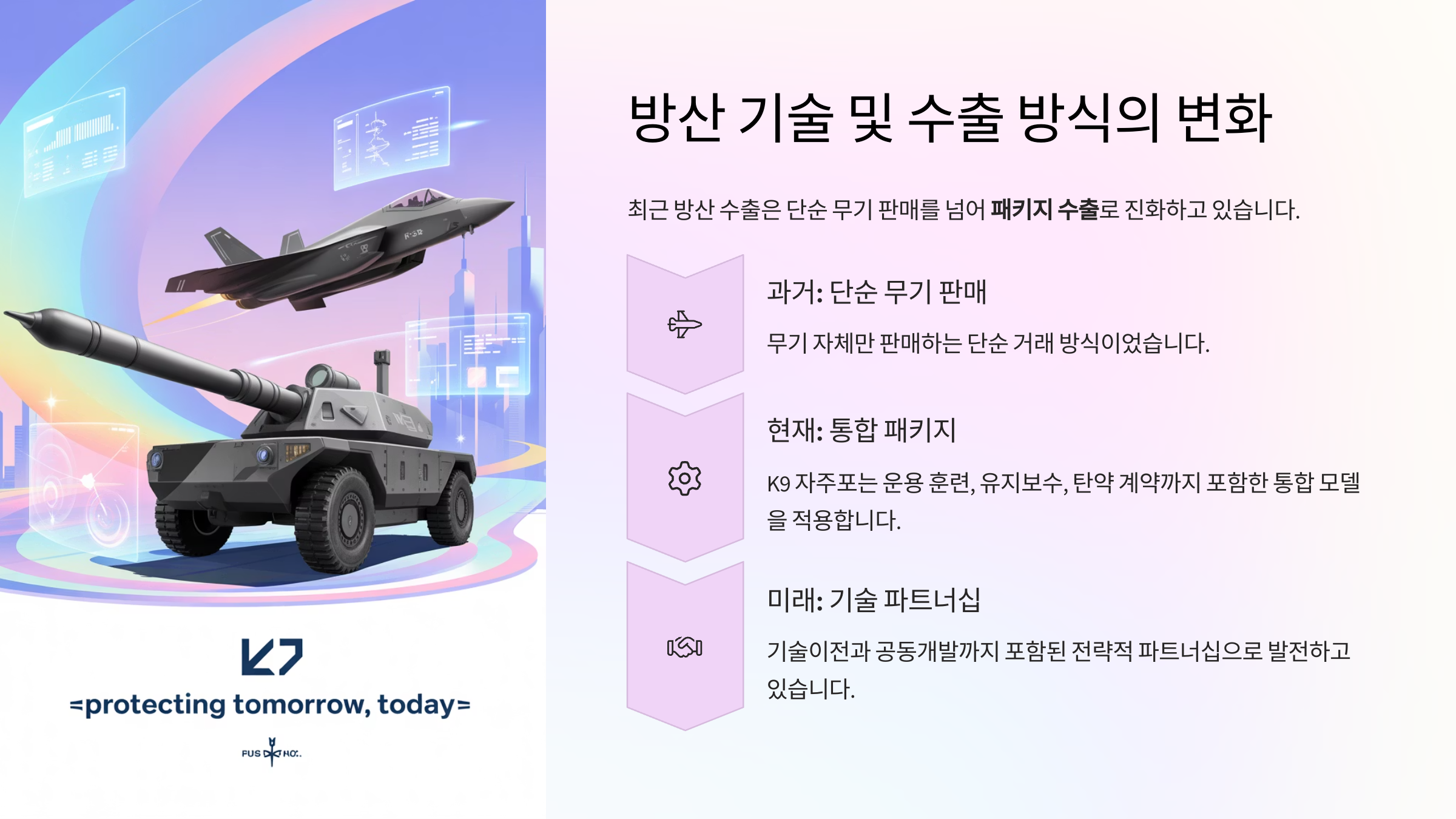 최근의 방산 수출은 단순히 무기를 파는 것을 넘어서 ‘패키지 수출’로 진화하고 있습니다. 예를 들어, 한국의 K9 자주포는 운용 훈련, 유지보수 시스템, 탄약 계약까지 포함된 통합 수출 모델을 적용하고 있고, 미국도 F-35 전투기 수출에 기술이전과 조립공정 참여권을 포함하고 있습니다.