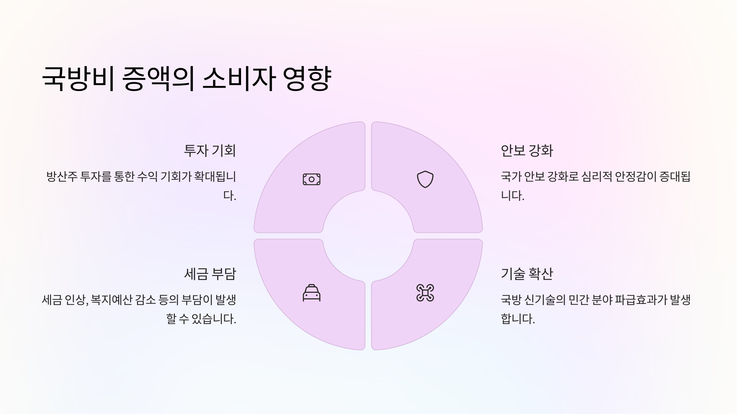 다만 세금 인상, 국가 재정 지출 부담 증가 등은 소비자에겐 간접적인 부담 요인이 될 수 있습니다. 특히 국방비 증액이 복지예산을 잠식하는 현상이 발생할 수 있습니다.
