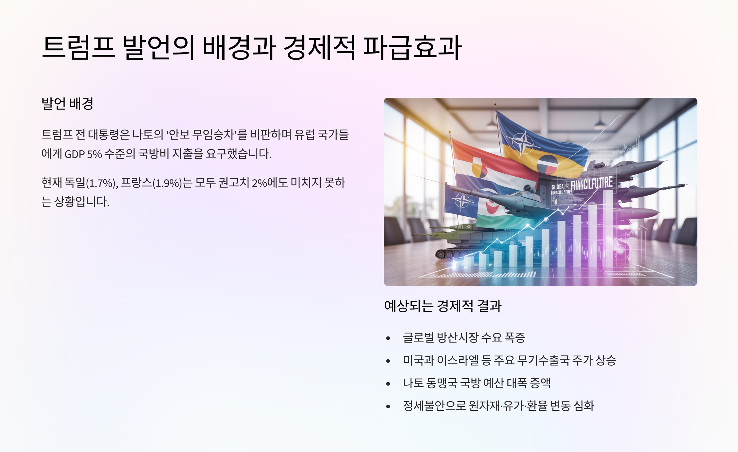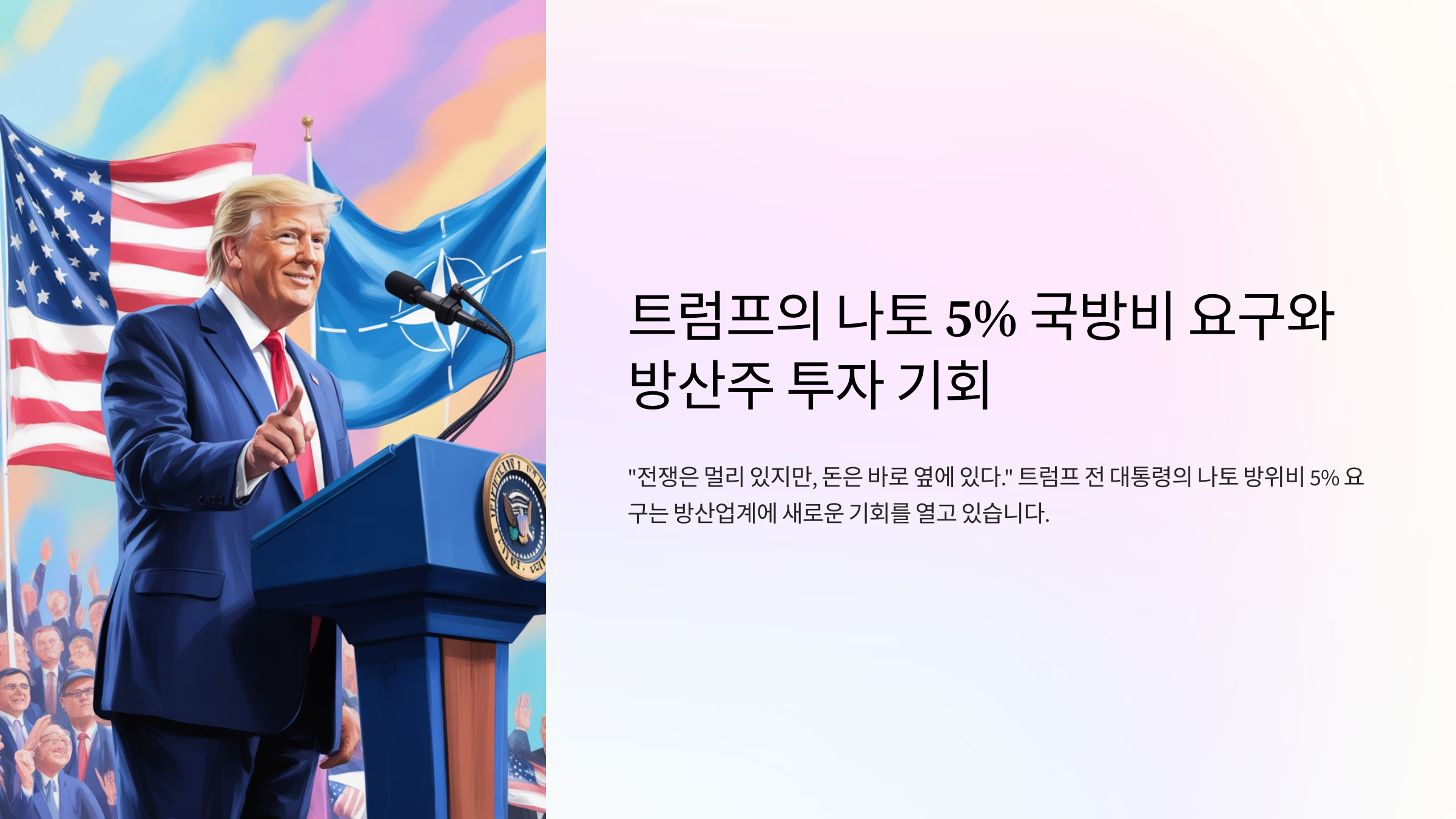 특히 최근 트럼프 전 대통령의 나토(NATO) 방위비 5% 요구 발언은 단순한 외교 메시지를 넘어 방산업계와 글로벌 증시에 직격탄을 날리고 있습니다.