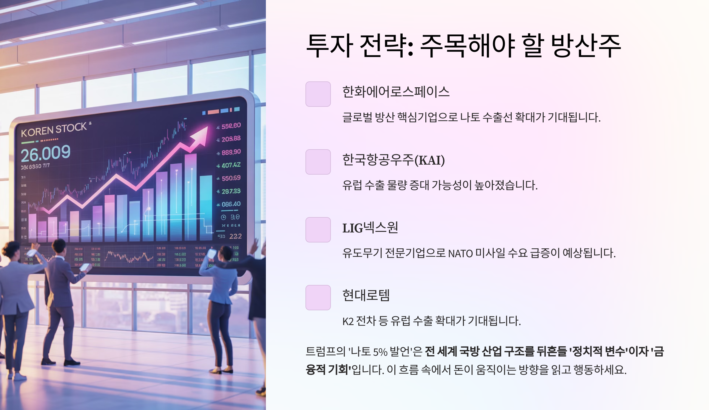 트럼프의 ‘나토 5% 발언’은 단순한 외교 논쟁이 아닙니다. 그것은 전 세계 국방 산업 구조를 뒤흔들 수 있는 ‘정치적 변수’이며 동시에 ‘금융적 기회’입니다. 지금 우리가 해야 할 일은 단순한 뉴스 소비가 아닌, 이 흐름 속에서 돈이 움직이는 방향을 읽고 행동하는 것입니다.