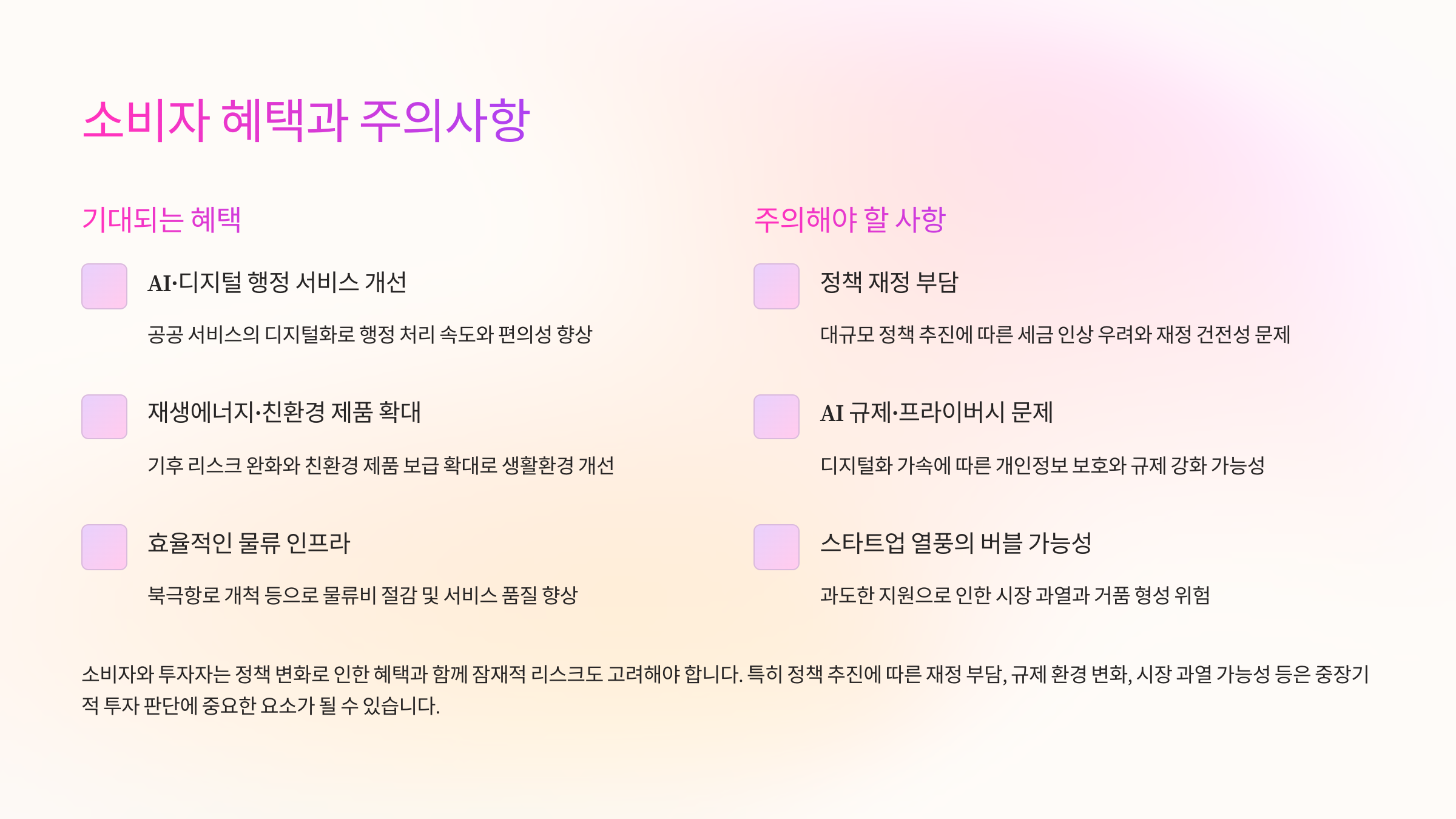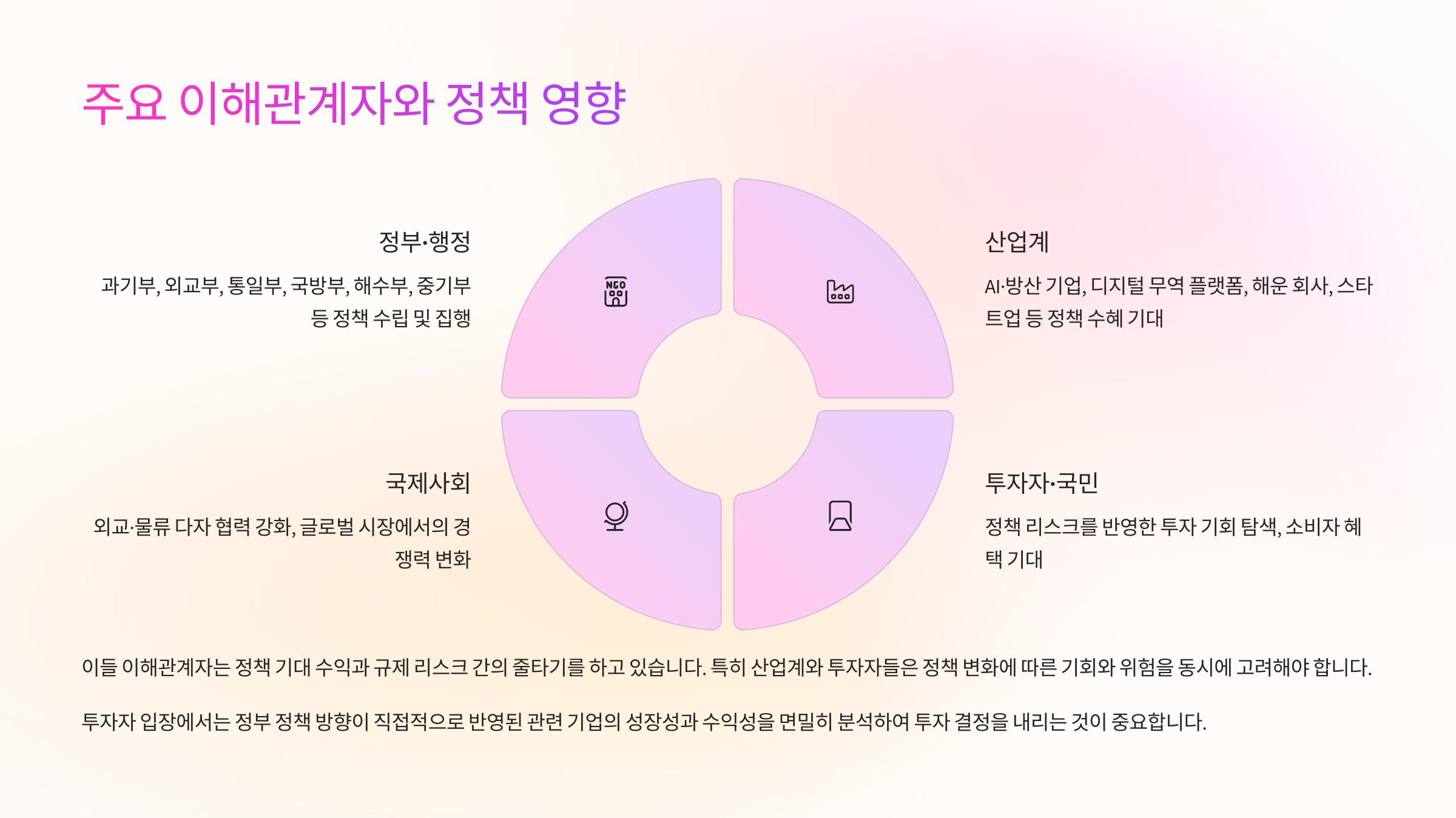 - 투자자·국민: 정책 리스크를 반영한 투자 기회 탐색, 소비자 혜택 기대