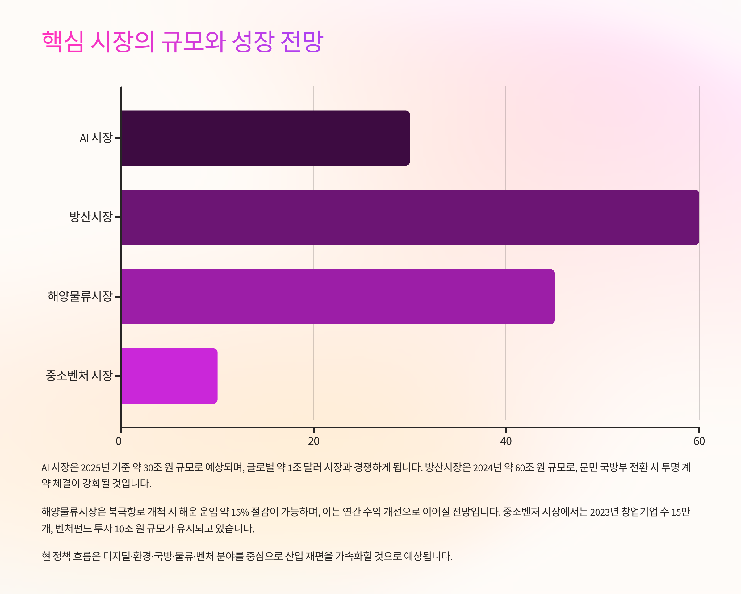 - 방산시장: 2024년 약 60조 원 규모, 문민 국방부 전환 시 투명 계약 체결 강화