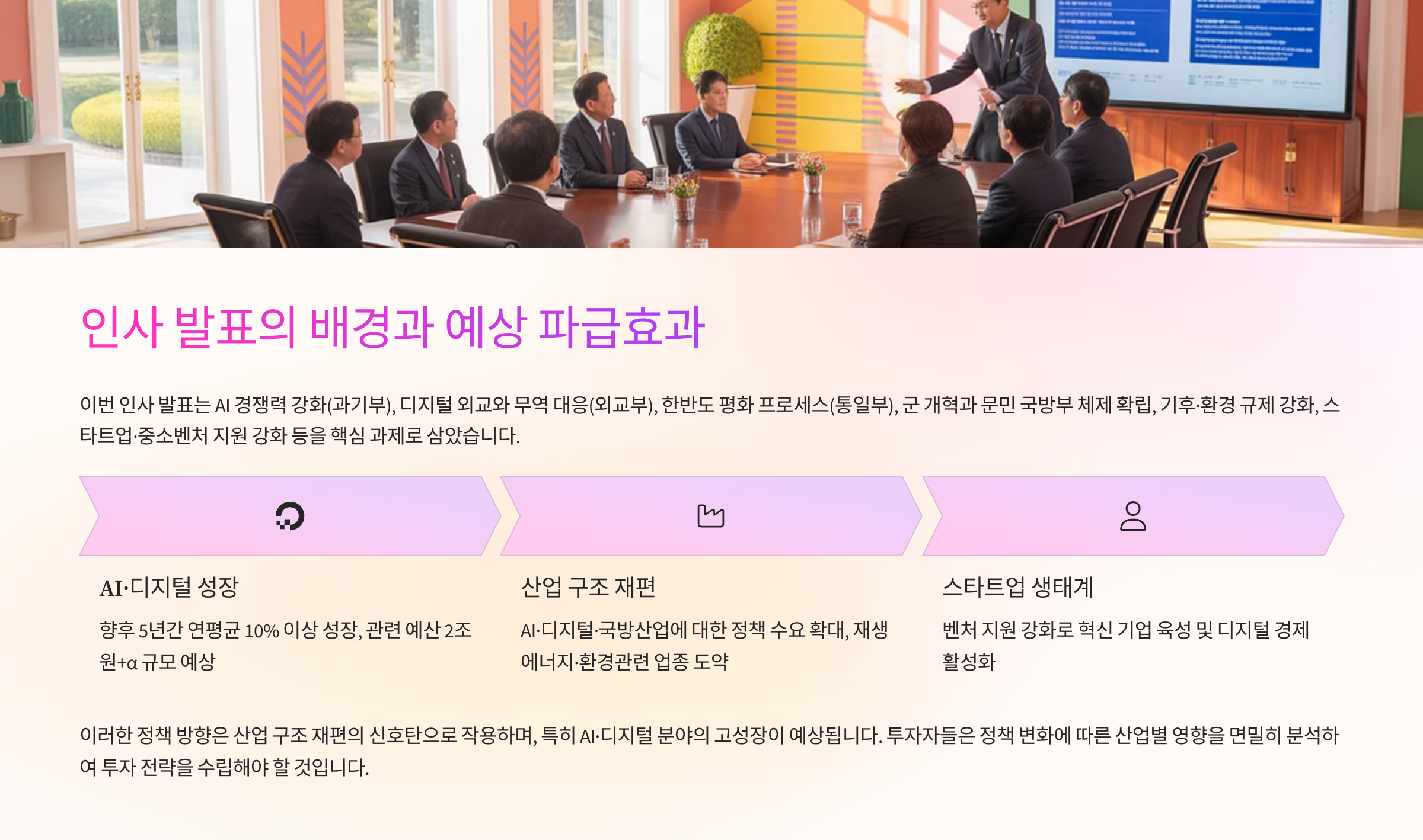 현 정책 흐름은 디지털·환경·국방·물류·벤처 분야를 중심으로 산업 재편을 가속화할 것입니다.