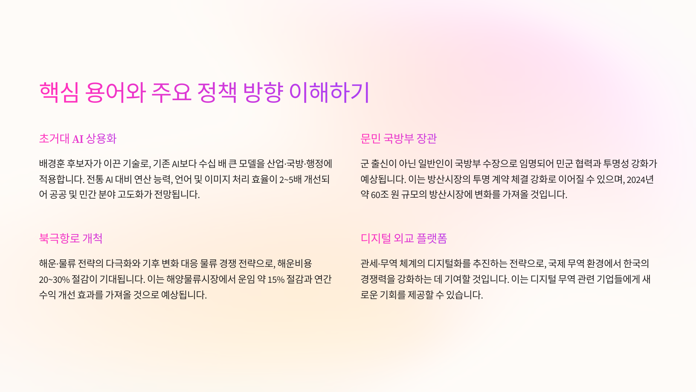 - 초거대 AI 상용화: 배경훈 후보자가 이끈 AI 기술로, 기존 AI보다 수십 배 큰 모델을 산업·국방·행정에 적용