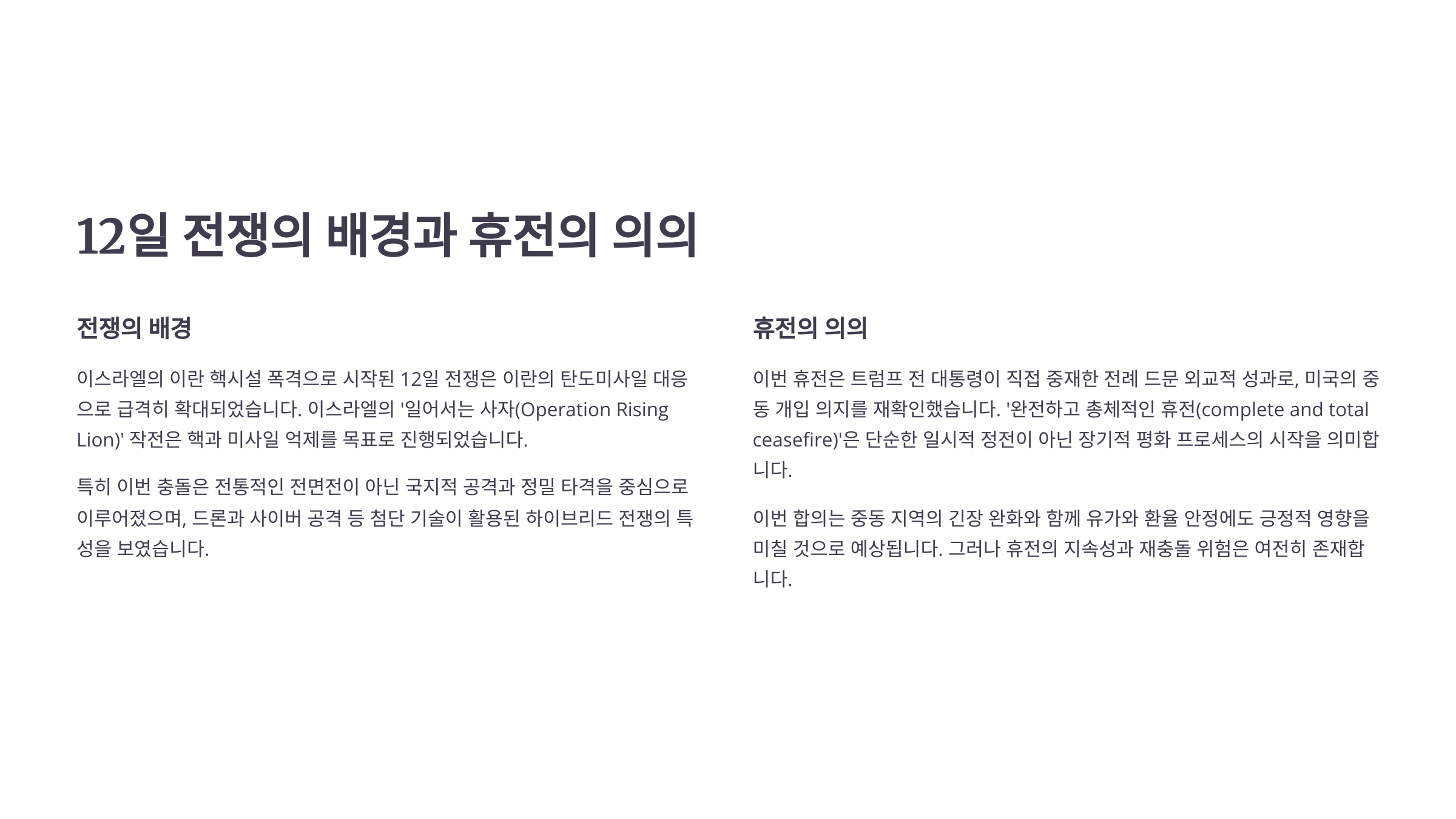 이번 이스라엘·이란 휴전은 중동 지역 불안을 잠재우는 중요한 분기점입니다. 그러나 휴전의 지속성과 재충돌 위험은 여전히 존재합니다.
