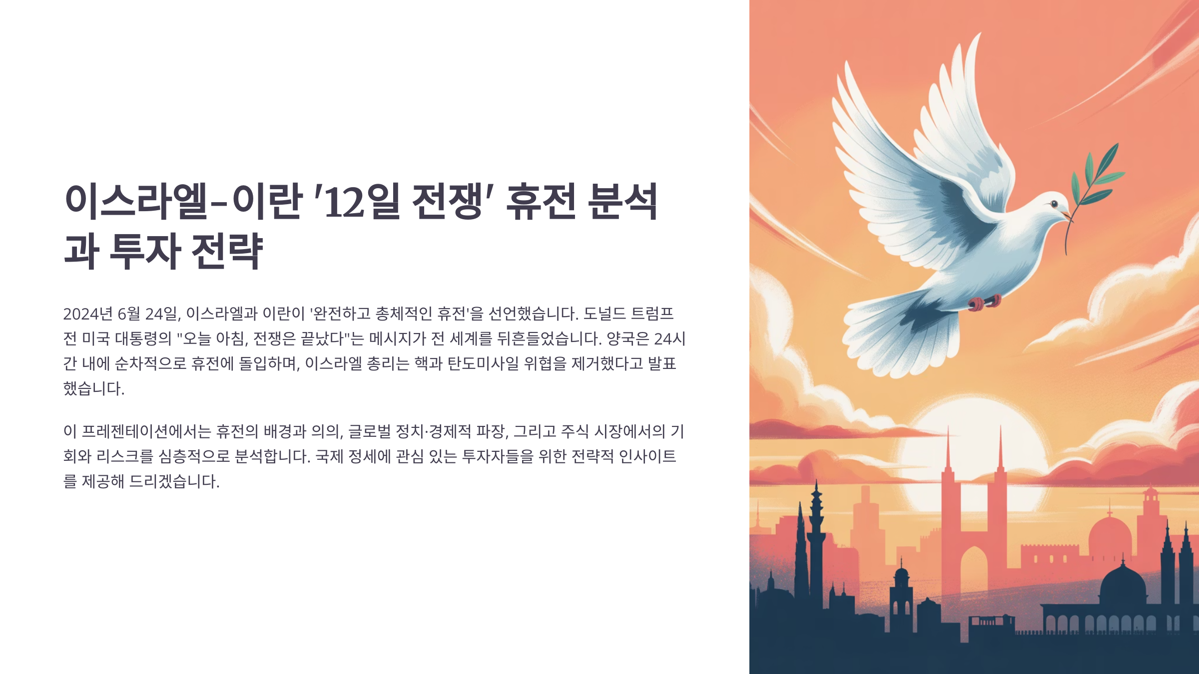 이 블로그에서는 이 극적인 휴전 배경, 글로벌 정치·경제적 파장, 그리고 주식 시장에서의 기회와 리스크까지 심층적으로 분석해드립니다. 여러분은 이 글을 통해 관련주 투자 전략을 세우고 국제 정세에 대한 안목을 키울 수 있습니다.