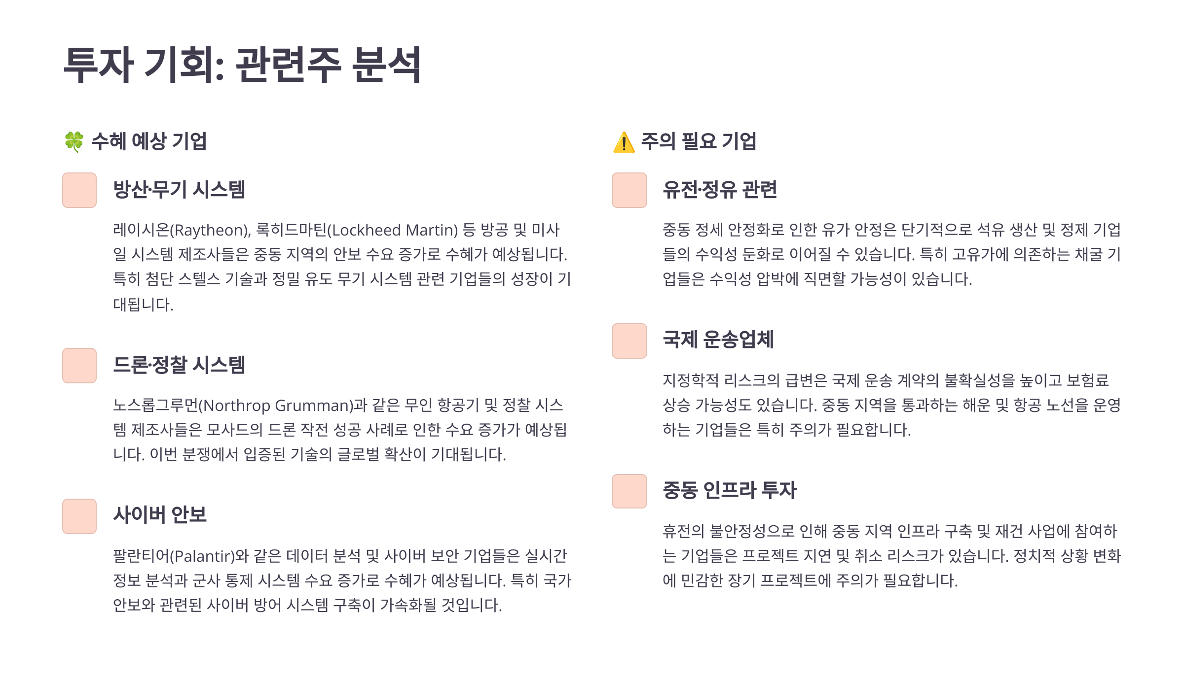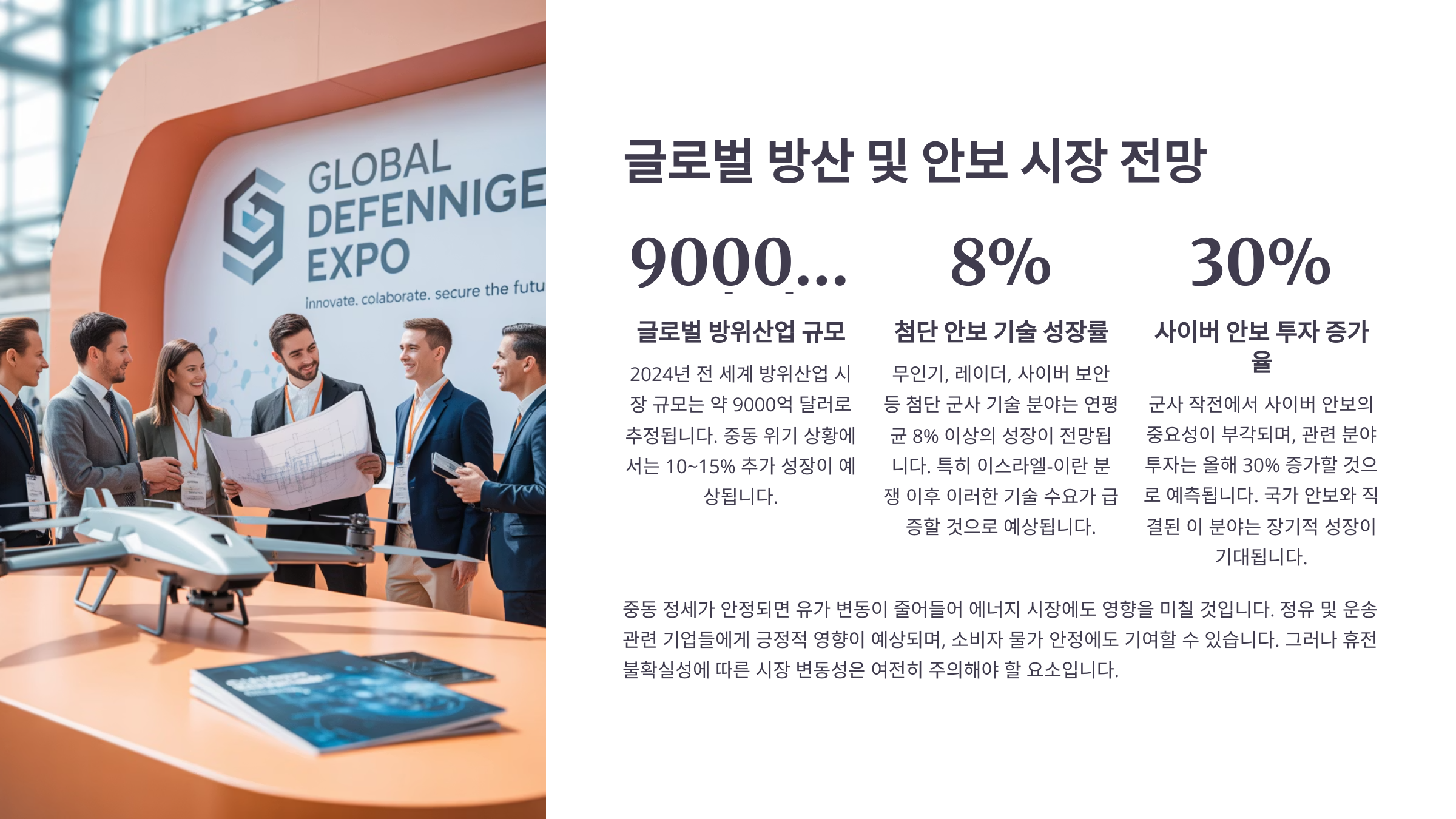 - 방산 시장: 글로벌 방위산업 2024년 약 9000억 달러 규모, 중동 위기 시 10~15% 증가 예상.