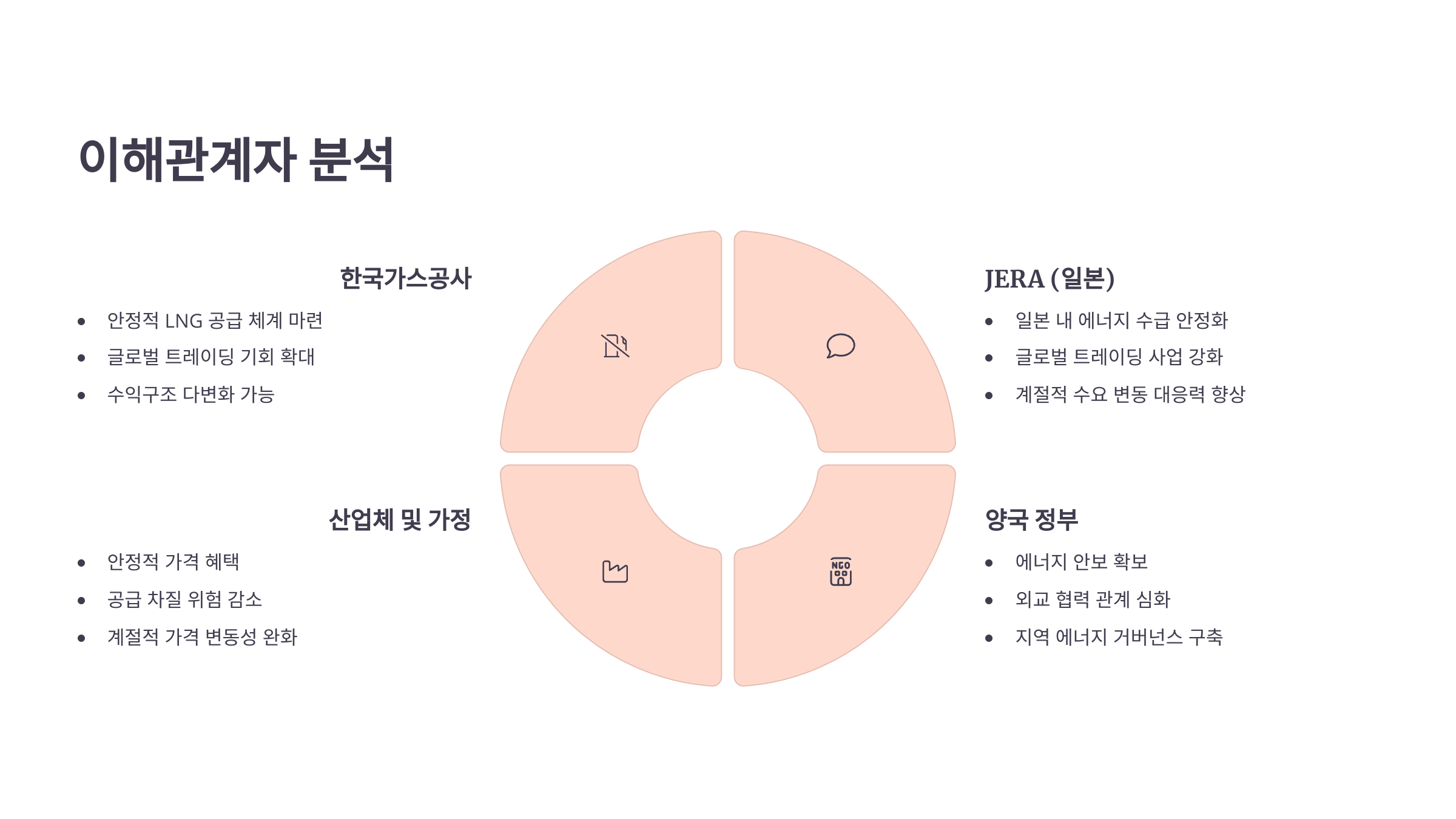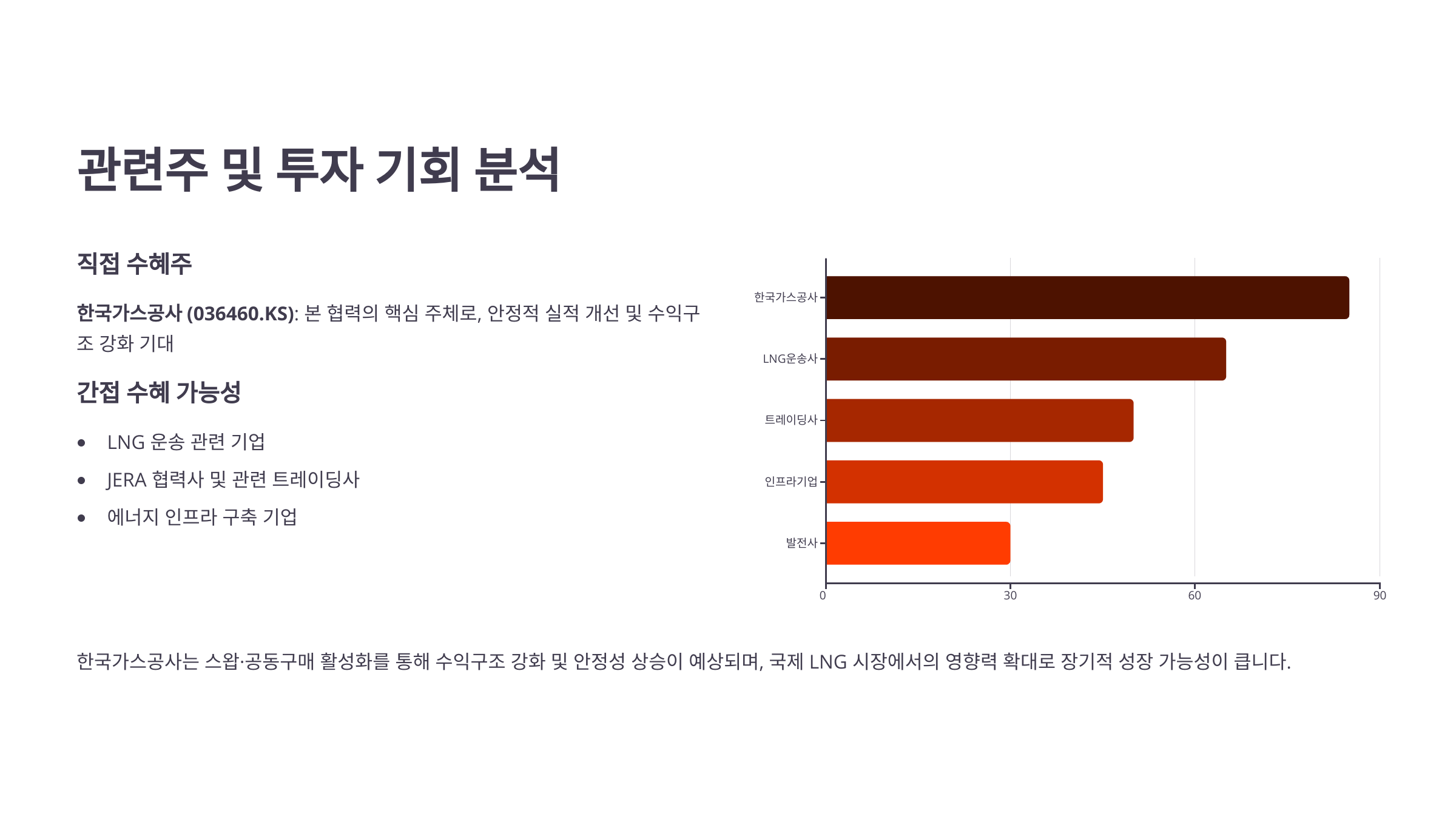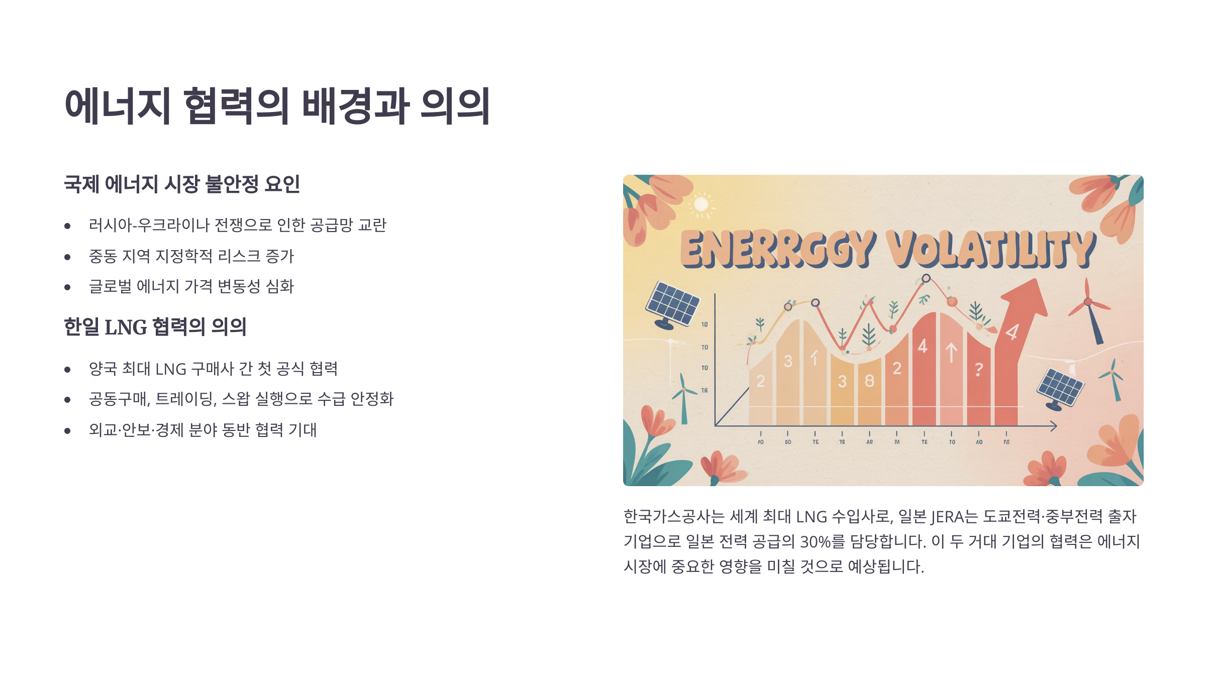 - 수치적 근거: 일본 JERA는 도쿄전력·중부전력 출자기업으로 일본 전력 공급의 30% 규모 담당 . 한국가스공사 세계 최대 LNG 수입사로 역할 확대 .