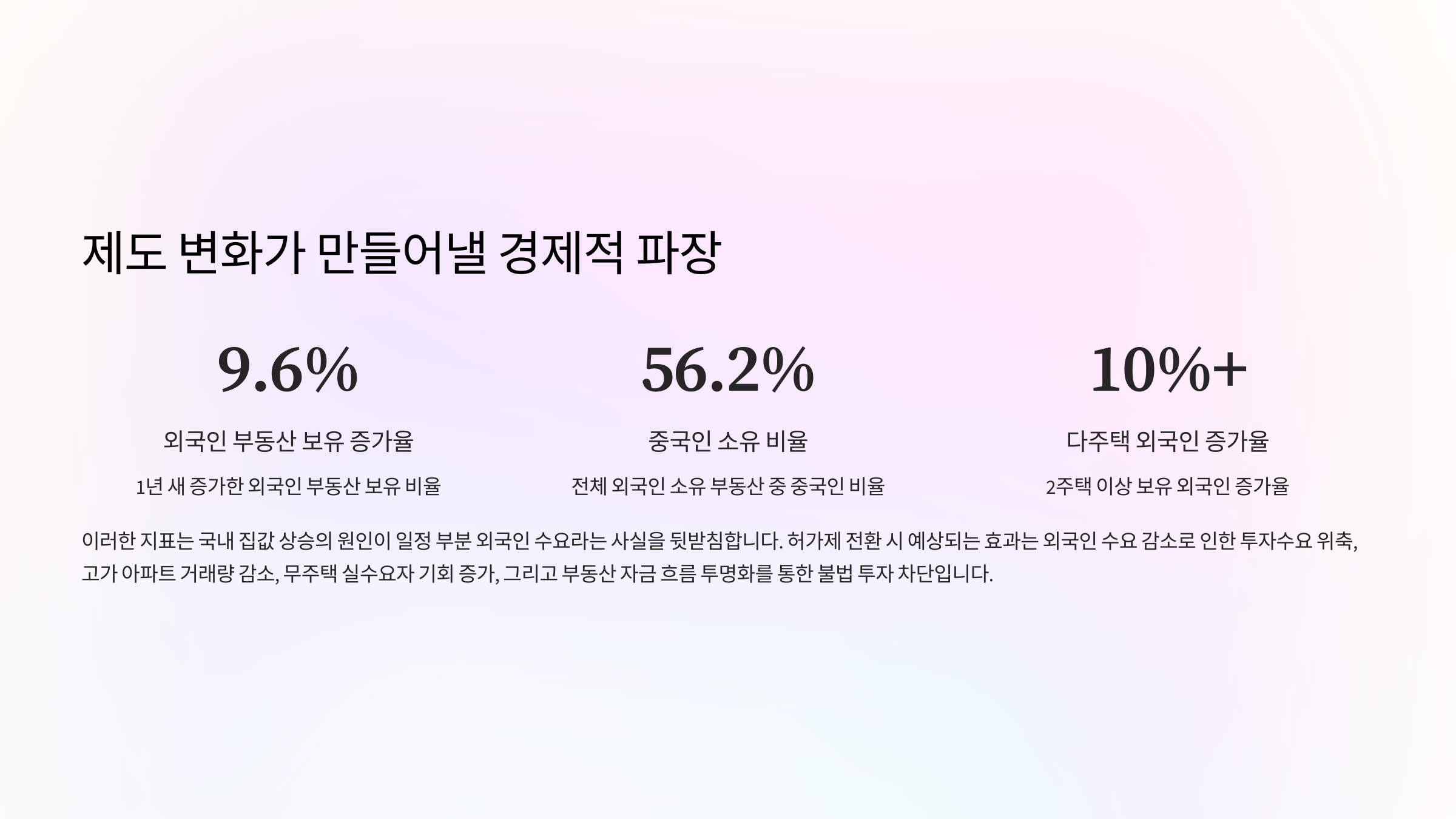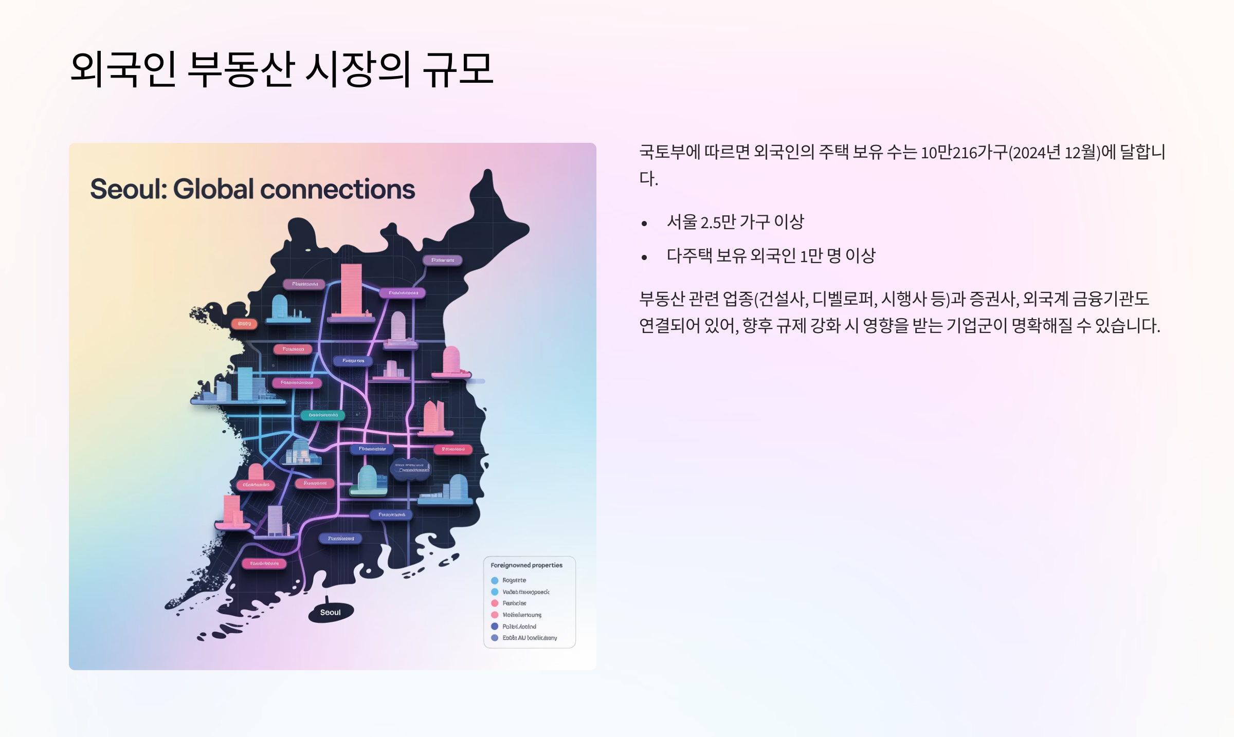 - 외국인 집중 구역(예: 서울 강남권) 집값 안정 기대