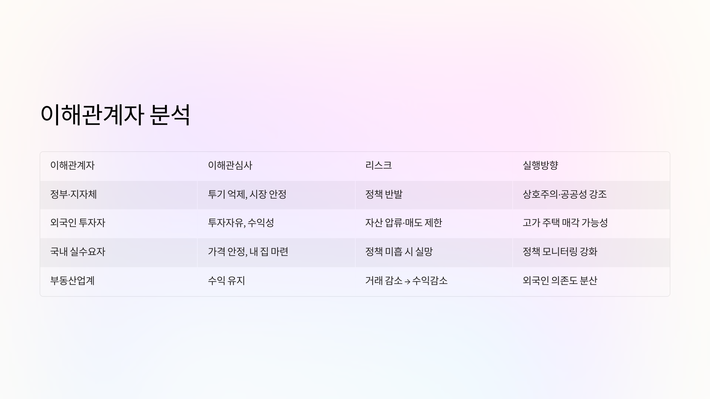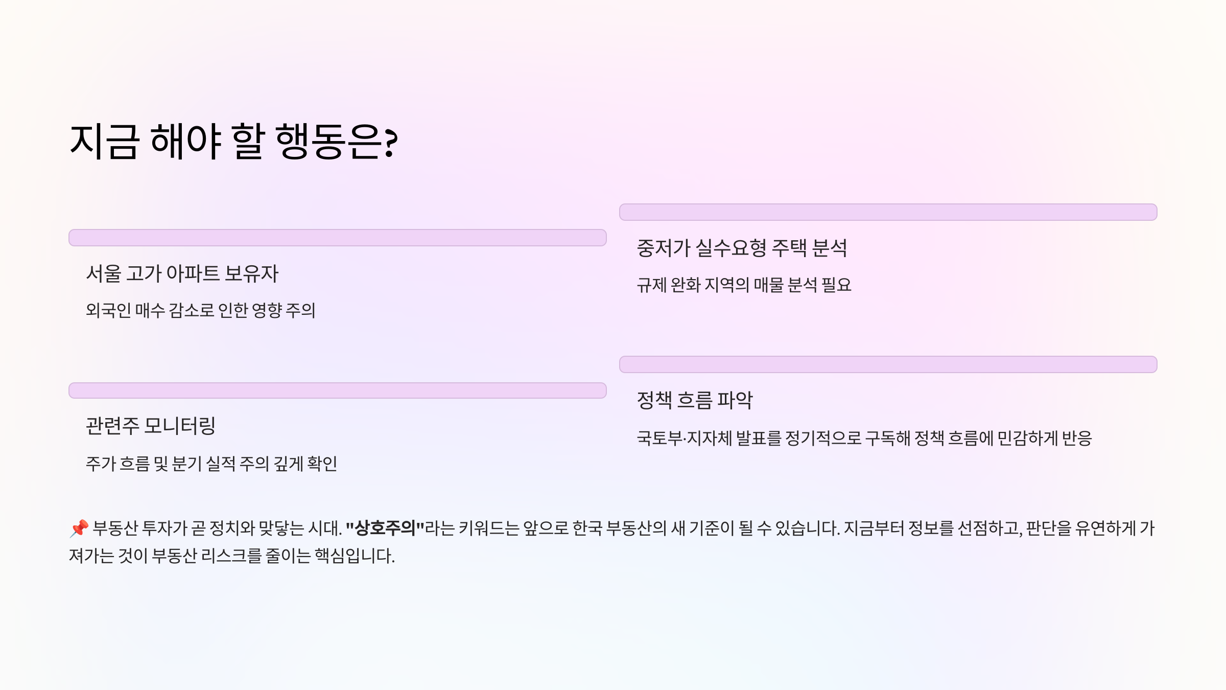 | 국내 실수요자 | 가격 안정, 내 집 마련 | 정책 미흡 시 실망 | 정책 모니터링 강화 |