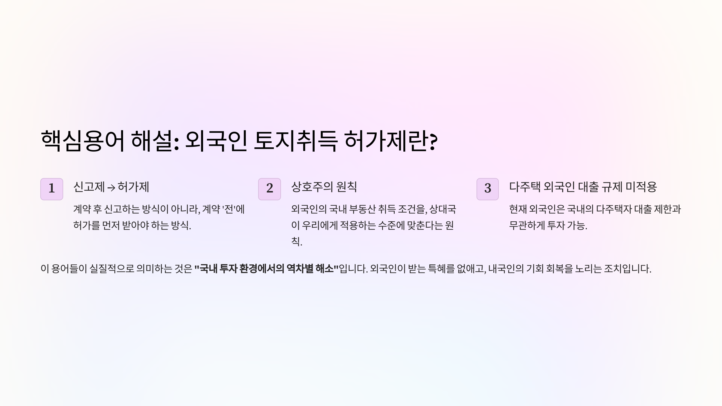 이 용어들이 실질적으로 의미하는 것은 "국내 투자 환경에서의 역차별 해소"입니다. 외국인이 받는 특혜를 없애고, 내국인의 기회 회복을 노리는 조치죠.