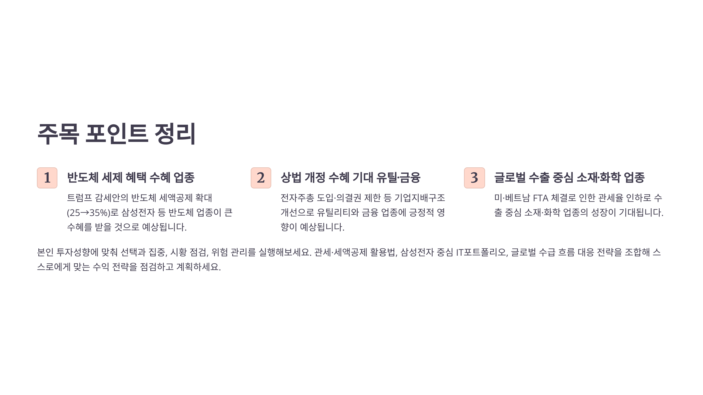 투자자는 ‘관세·세액공제 활용법’, 삼성전자 중심 IT포트폴리오, 글로벌 수급 흐름 대응 전략을 조합해, 스스로에게 맞는 수익 전략을 점검하고 계획하여야 합니다.