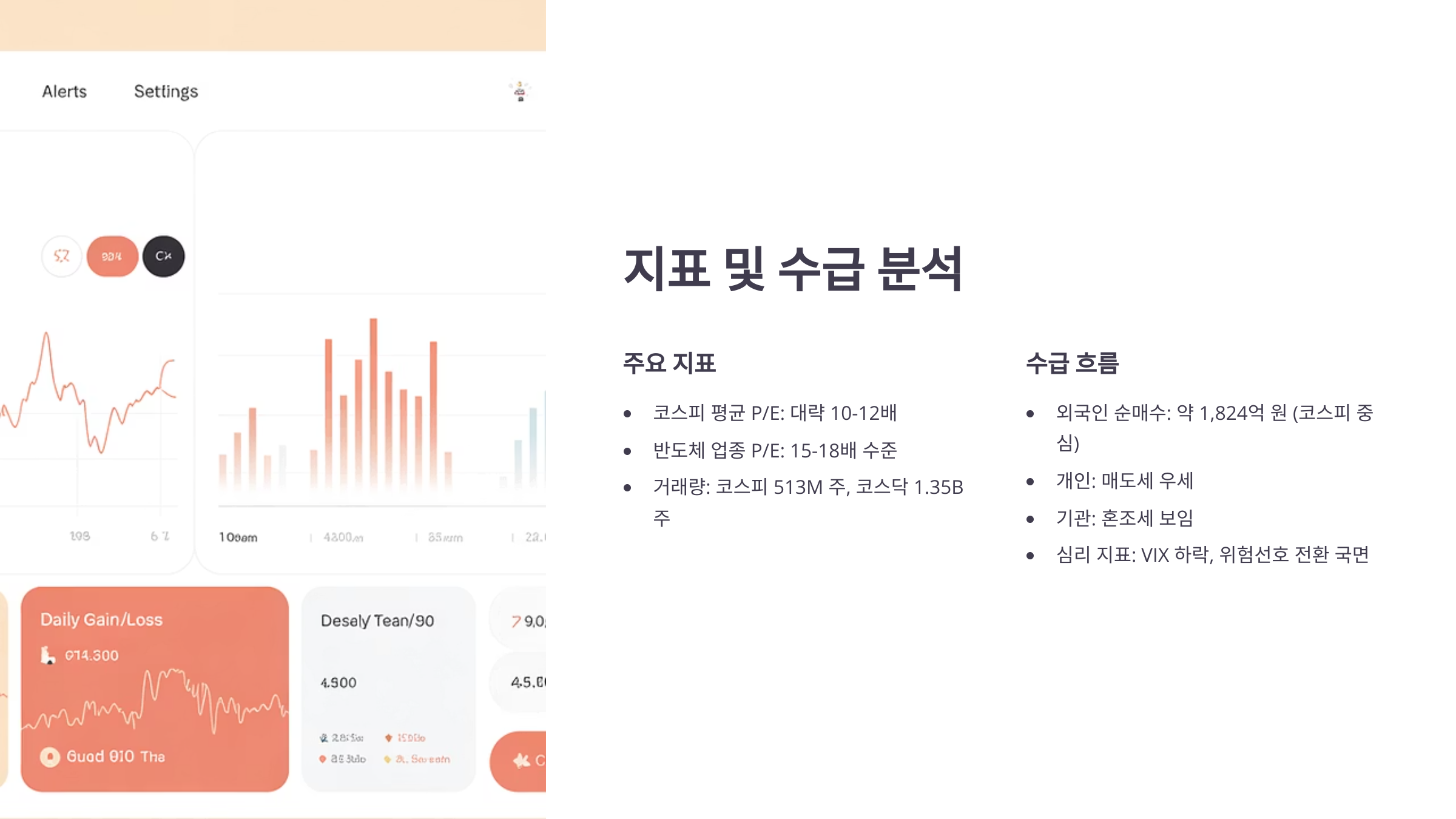 - P/E, P/B: 코스피 평균 P/E 대략 10~12배,반도체 업종은 세제혜택 기대에 15~18배 수준