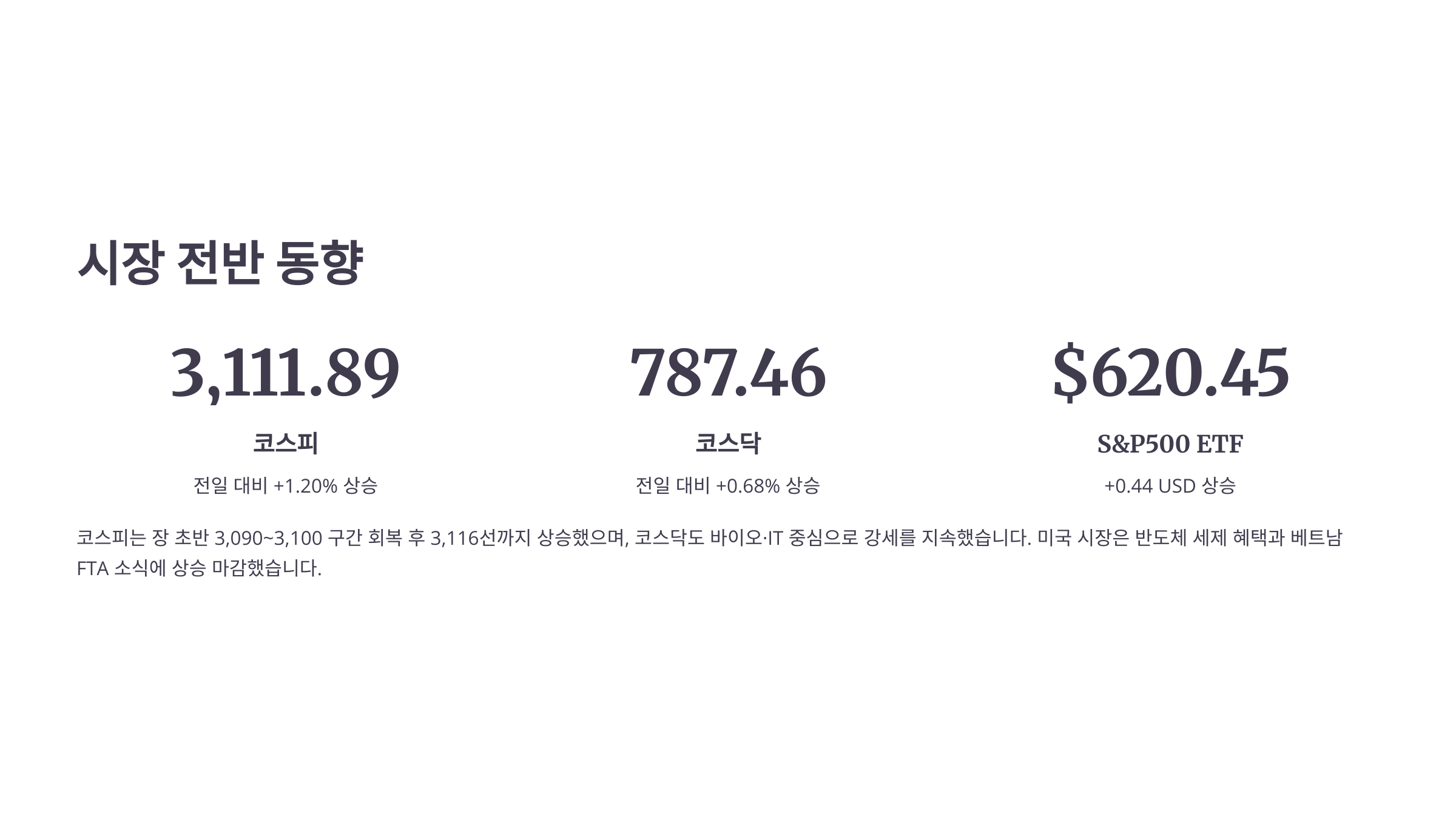 한국 증시가 2025년 7월 3일, 코스피 3,111.89(+1.20%), 코스닥 787.46(+0.68%), S&P500 ETF(SPY) 620.45USD로 강한 상승 흐름을 보였습니다.