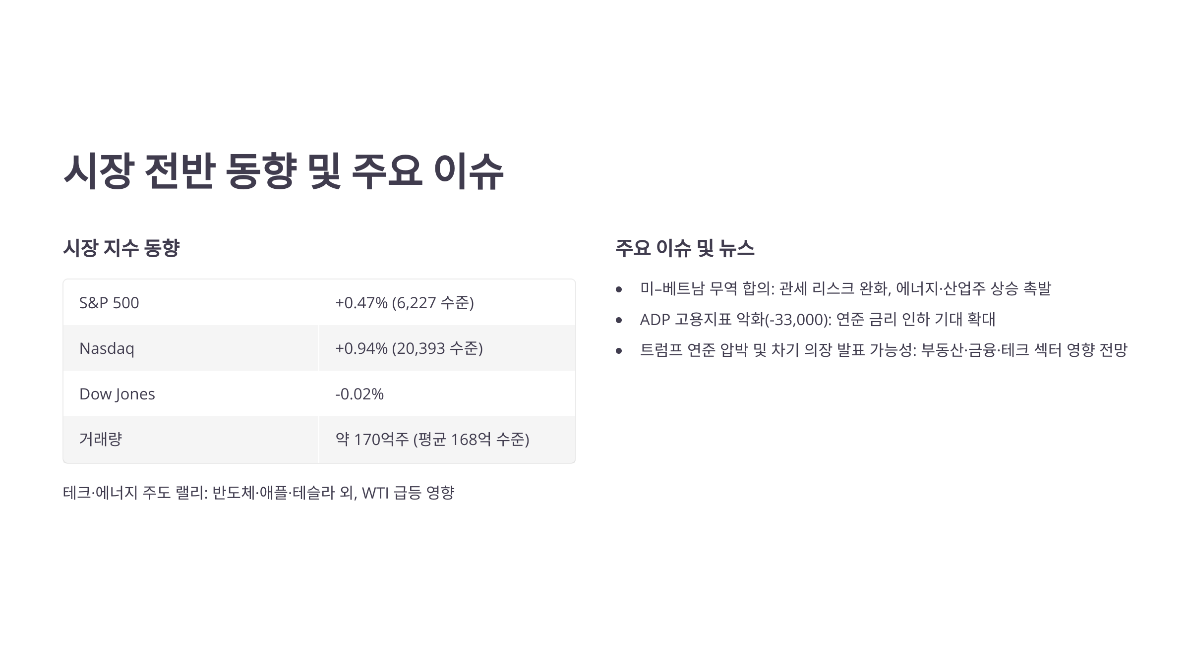 - 미–베트남 무역 합의: 관세 리스크 완화, 에너지·산업주 상승 촉발