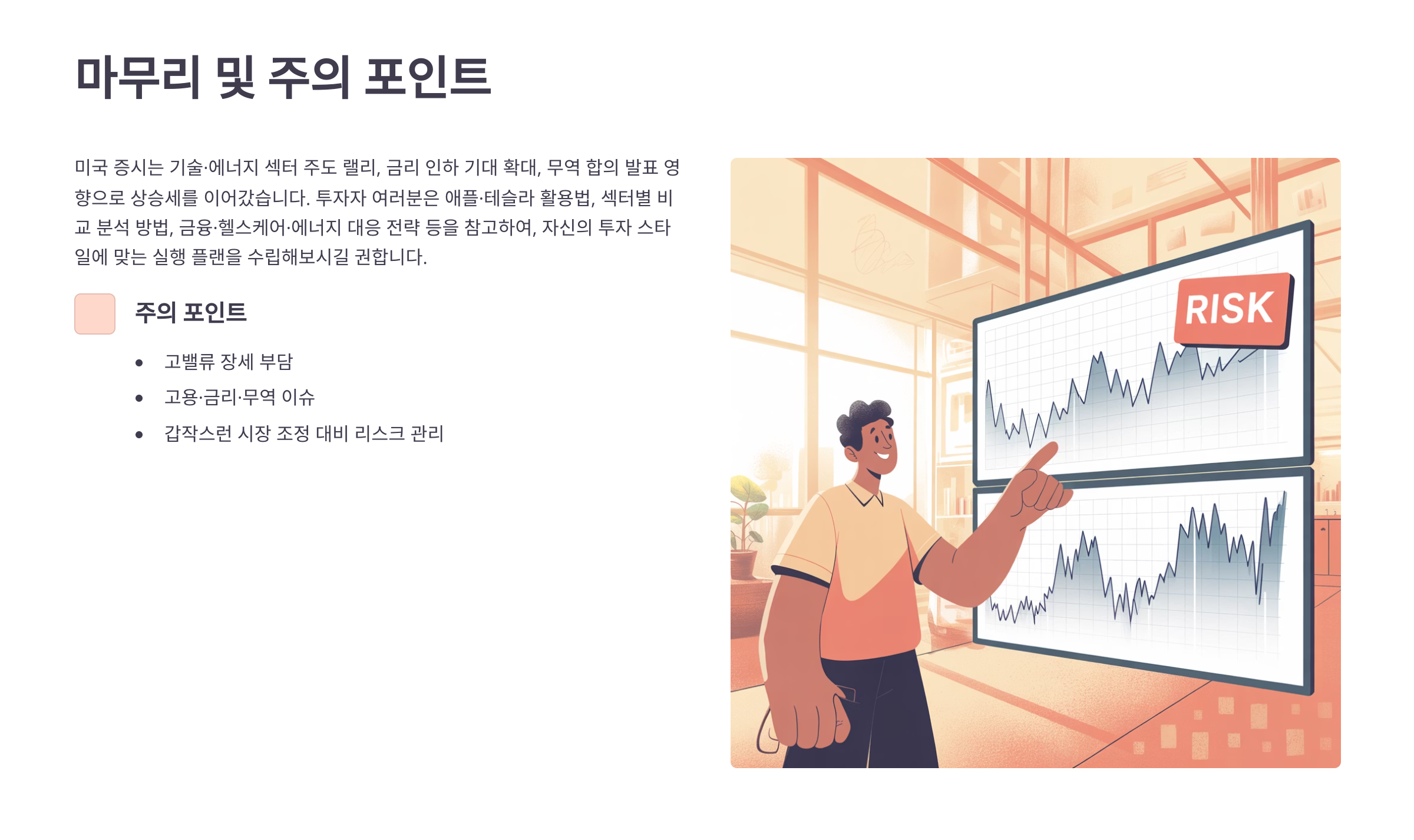 투자자 여러분은 애플·테슬라 활용법, 섹터별 비교 분석 방법, 금융·헬스케어·에너지 대응 전략 등을 참고하여, 자신의 투자 스타일에 맞는 실행 플랜을 수립해보시길 권합니다.