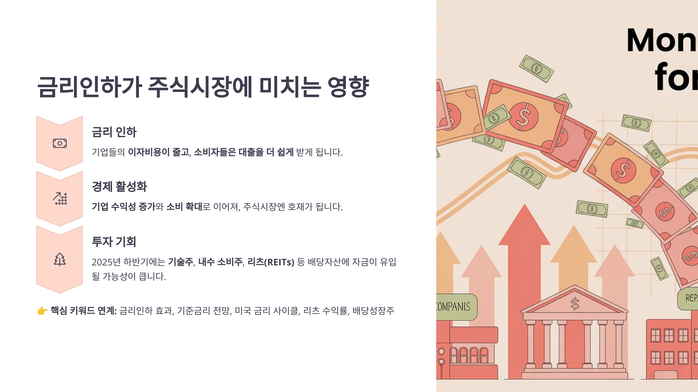 👉 핵심 키워드 연계: 금리인하 효과, 기준금리 전망, 미국 금리 사이클, 리츠 수익률, 배당성장주