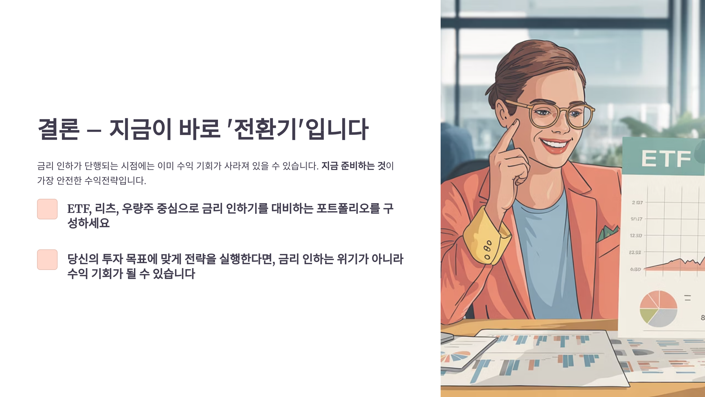 당신의 투자 목표에 맞게 전략을 실행한다면, 금리 인하는 위기가 아니라 수익 기회가 될 수 있습니다.
