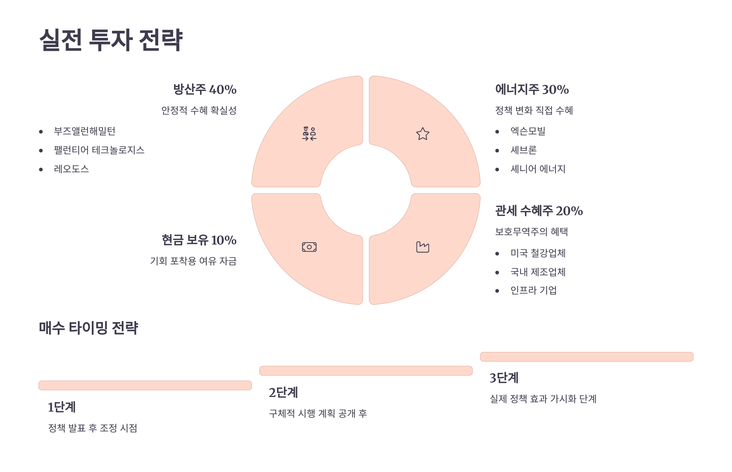 보수적 투자자: 대형 방산업체나 에너지 기업 중심의 안정적 포트폴리오 구성 적극적 투자자: 테마주와 펀더멘털 종목을 적절히 조합한 공격적 전략 장기 투자자: 정책 변화의 장기적 영향을 고려한 점진적 투자