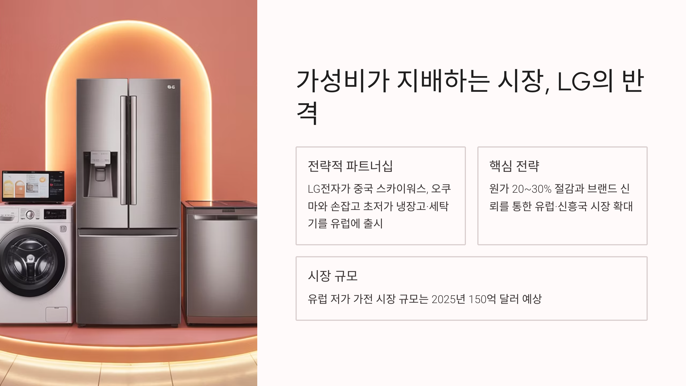하이엔드 시장만으로는 더 이상 성장할 수 없는 시대, 글로벌 경기 침체와 저소득층 확대는 초저가 가전 시장의 급성장을 불렀습니다. 유럽, 동남아, 남미를 무대로 ‘가성비 전쟁’이 벌어지는 지금, LG전자는 고급 이미지에만 안주하지 않고 중국과 손잡는 파격을 선택했습니다.