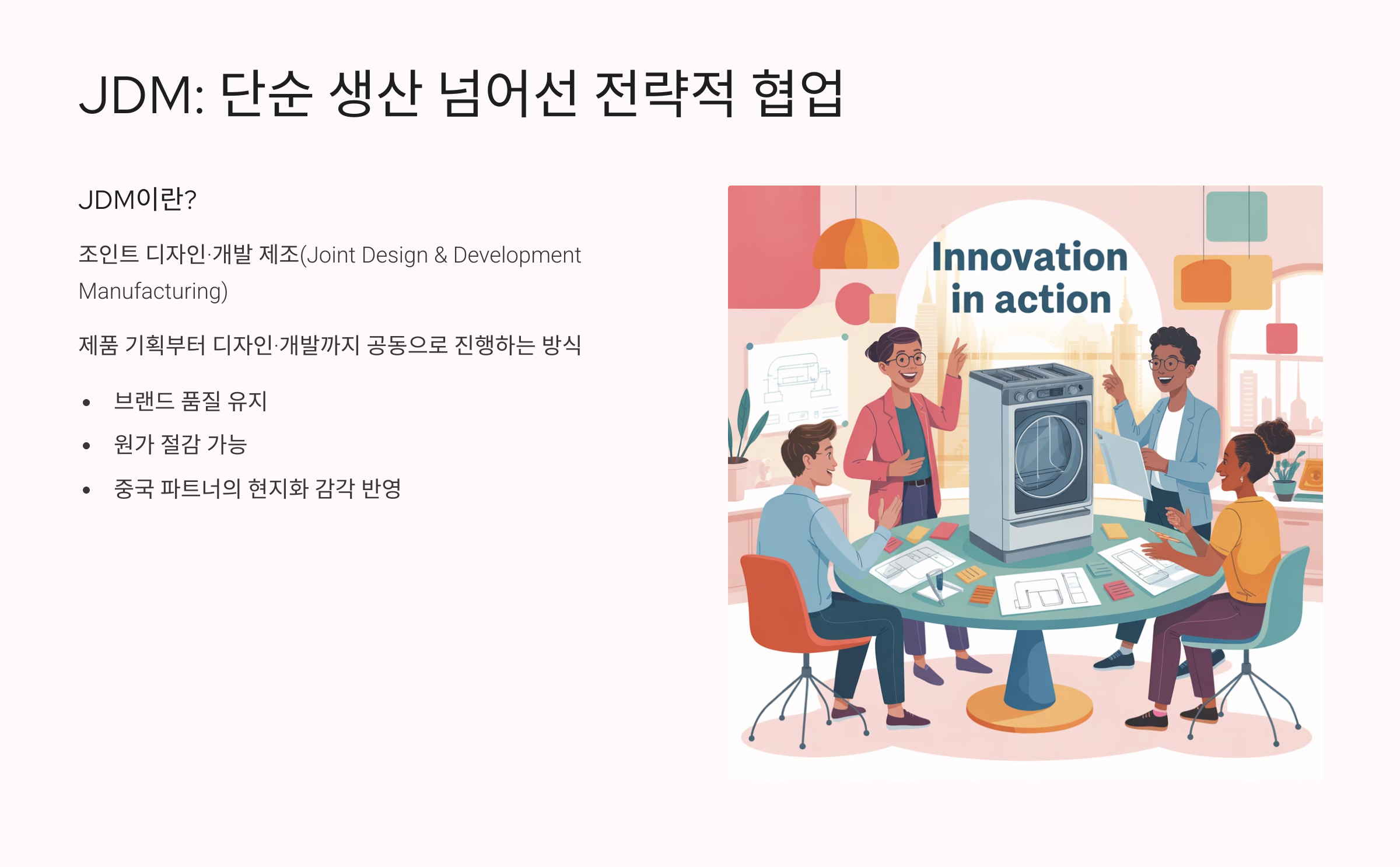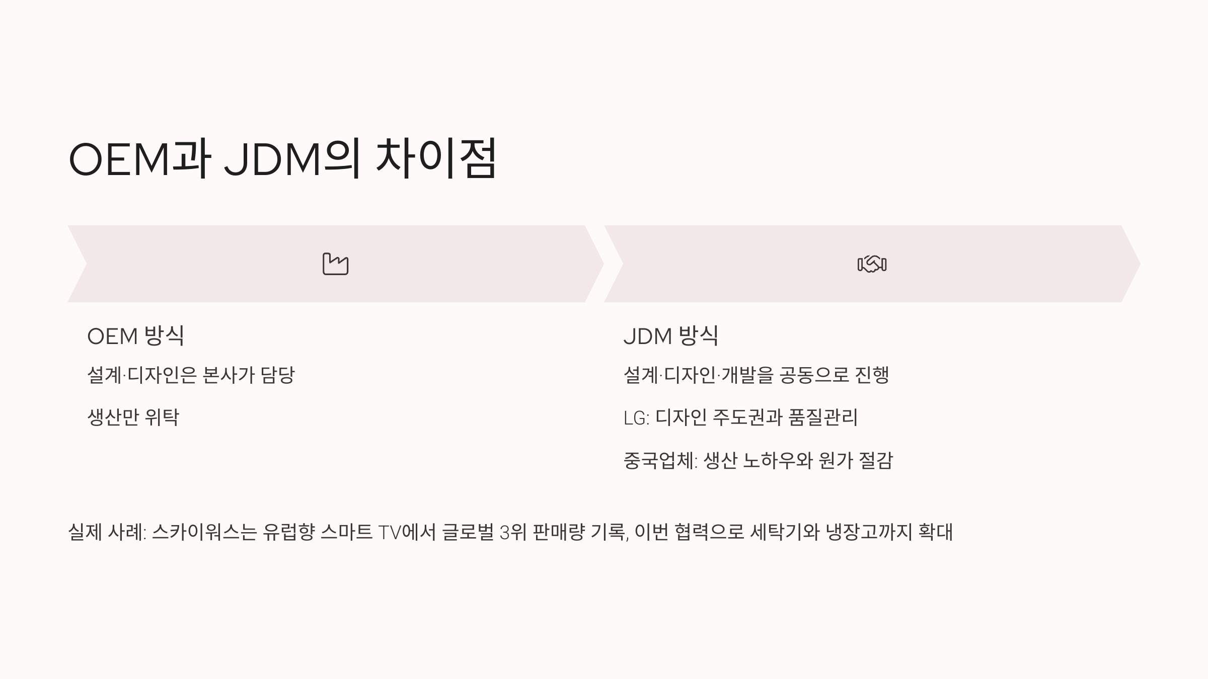 실제 사례로, 스카이워스는 유럽향 스마트 TV에서 글로벌 3위 판매량을 기록하며 가성비 강자로 자리잡았고, 이번 JDM 방식으로 LG와 협력해 세탁기와 냉장고로까지 확대됩니다.