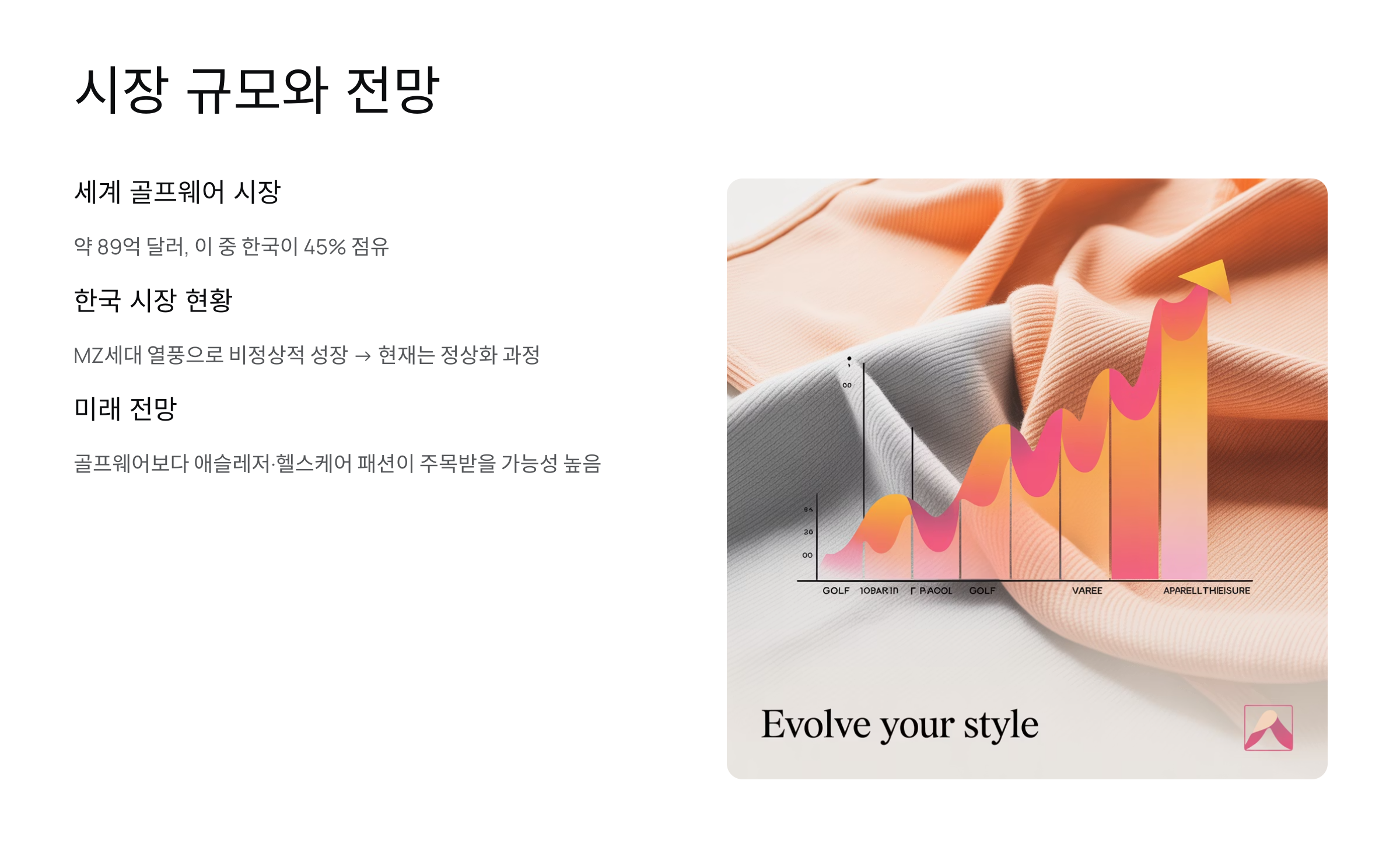- 세계 골프웨어 시장: 약 89억 달러, 이 중 한국이 45% 점유