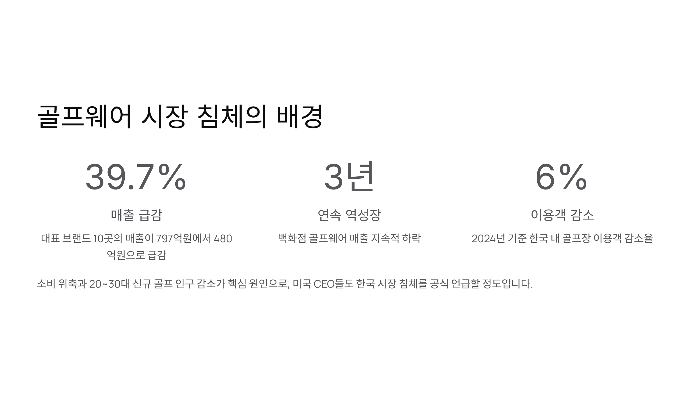 - 소비 위축 + 20~30대 신규 골프 인구 감소가 핵심 원인