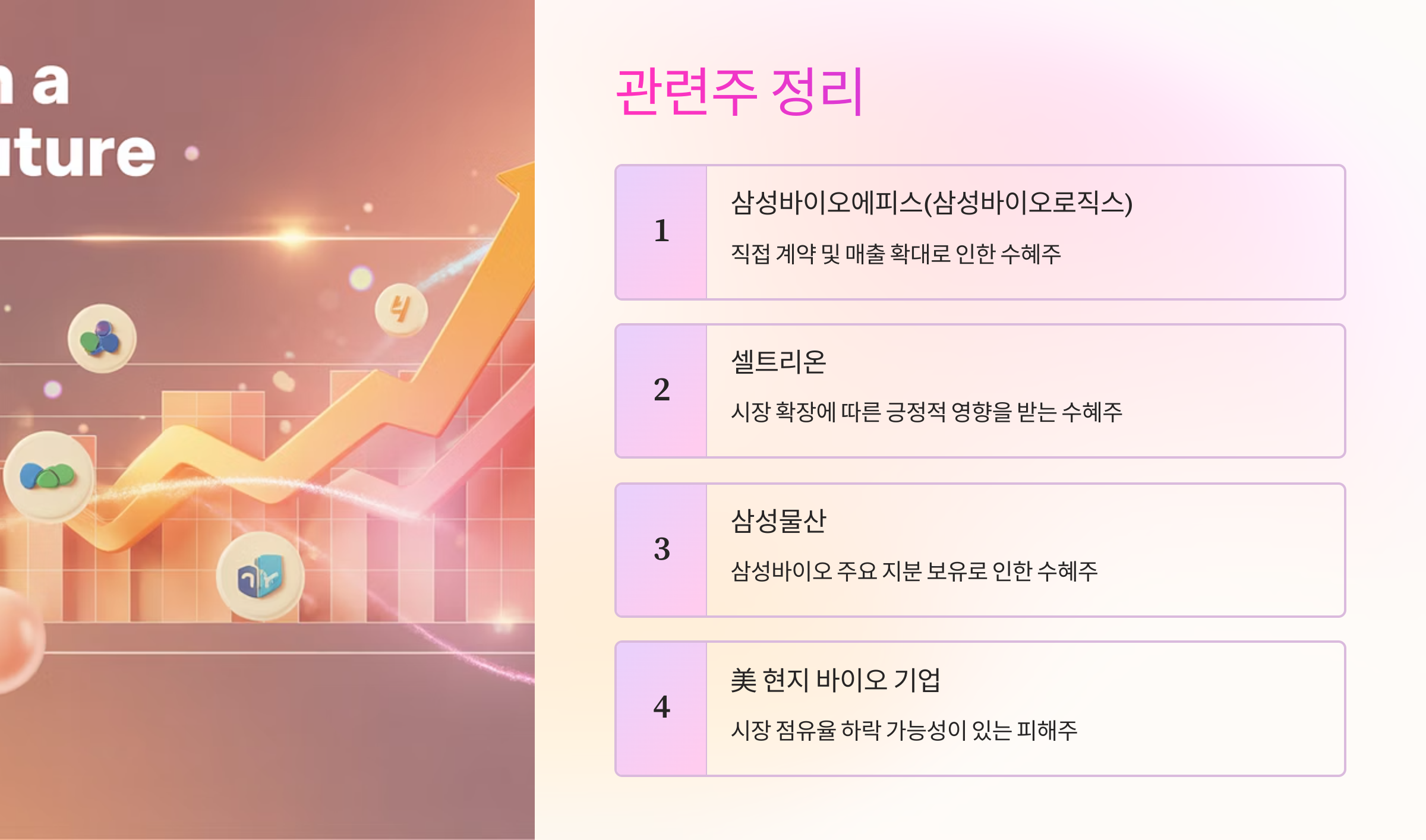 | 수혜주 | 삼성바이오에피스(삼성바이오로직스) | 직접 계약 및 매출 확대 |