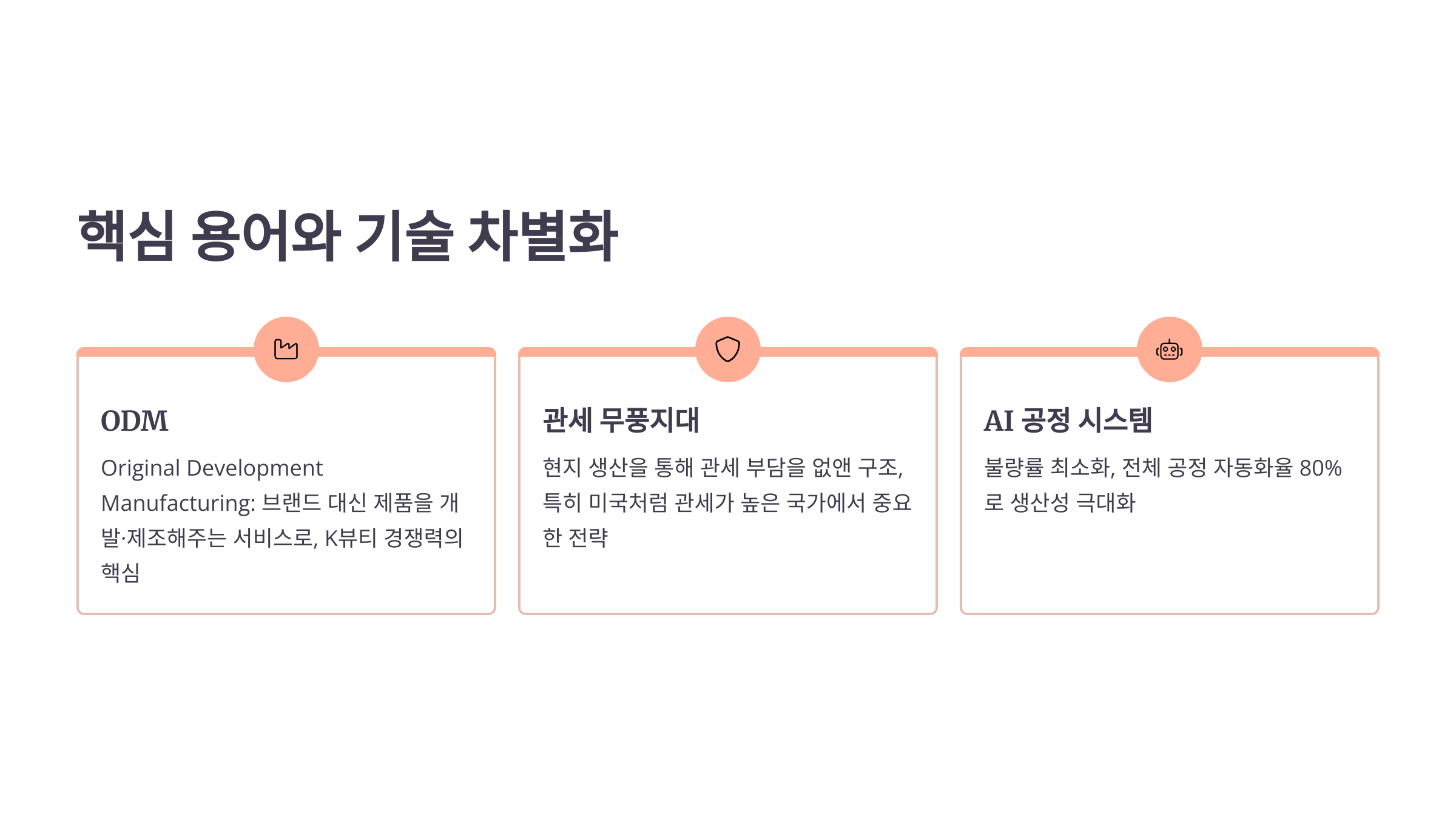브랜드 대신 제품을 개발·제조해주는 서비스로, 화장품 산업의 숨은 강자입니다. K뷰티의 경쟁력을 떠받치는 핵심입니다. - 관세 무풍지대