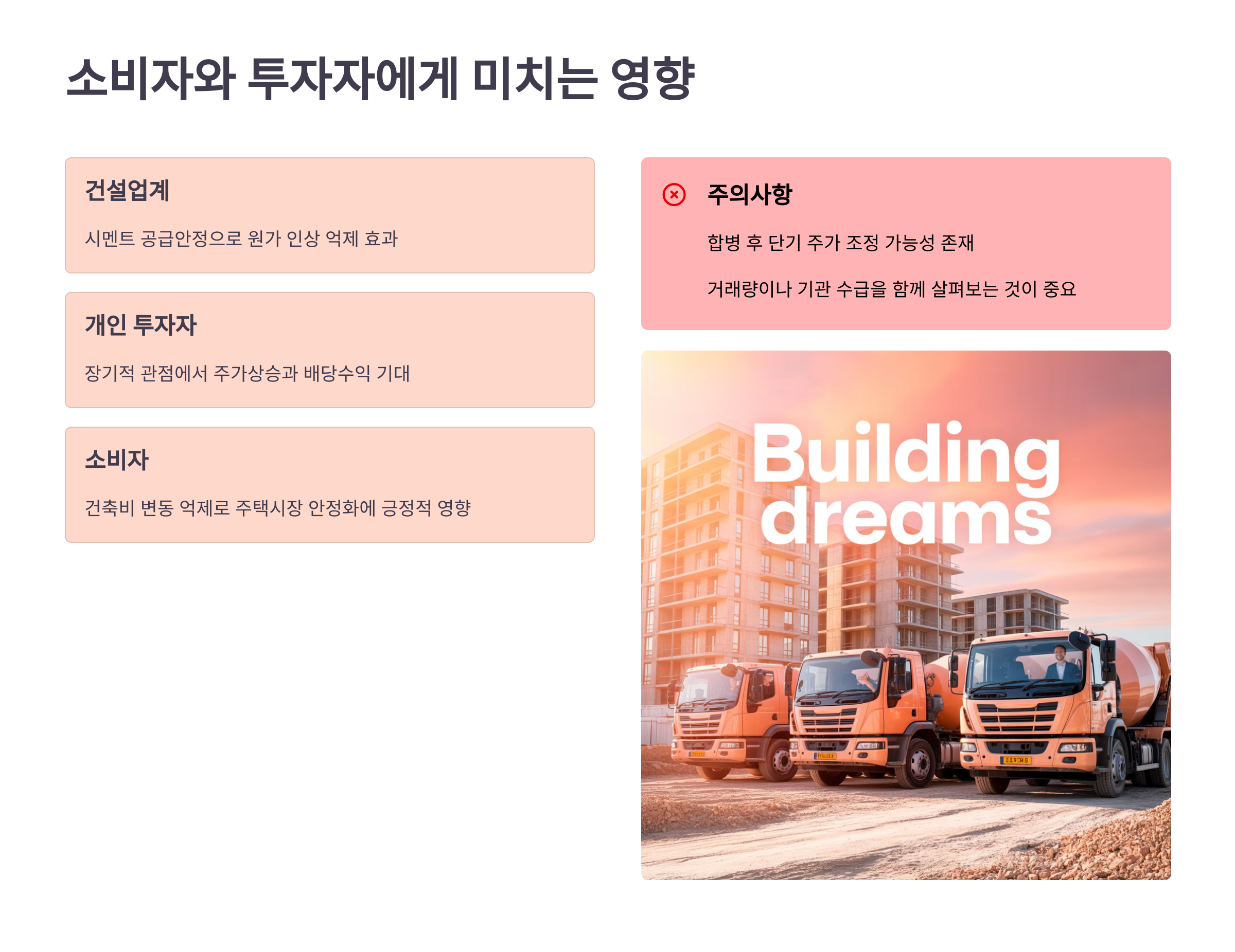 합병을 통해 생산, 물류, 유통까지 통합 운영하면 원가절감 + 투자효율로 경영개선이 예상됩니다. 국내 건설·인프라 경기 회복 시엔 최대 수혜주가 될 가능성도 큽니다.