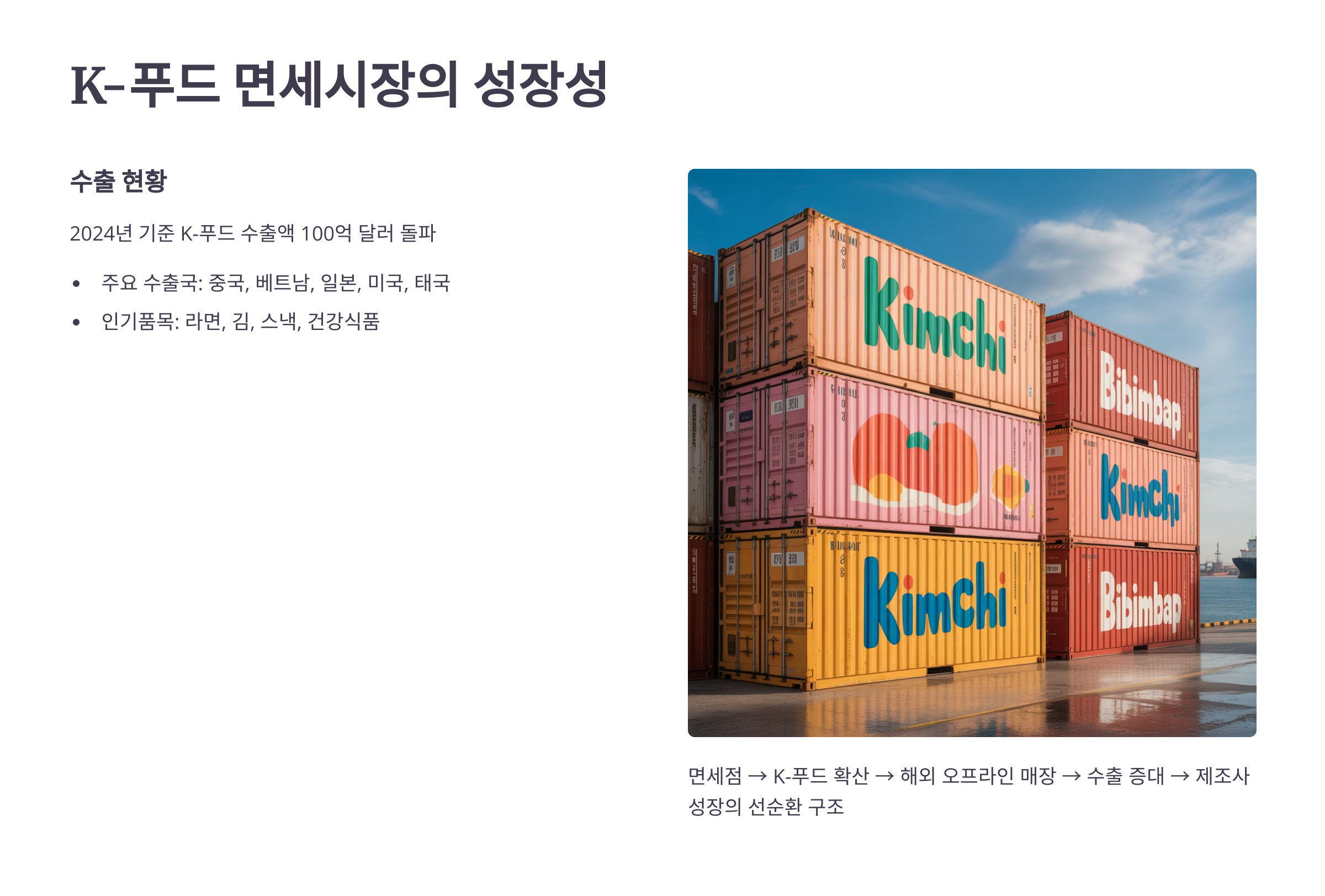 - 2024년 기준 K-푸드 수출액 100억 달러 돌파