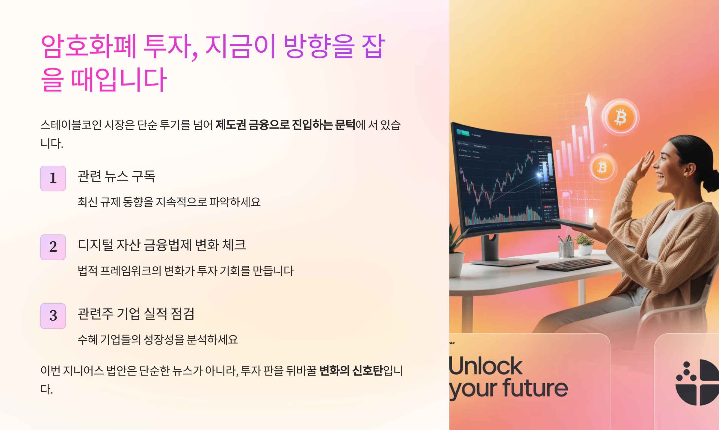 이번 지니어스 법안은 단순한 뉴스가 아니라, 투자 판을 뒤바꿀 변화의 신호탄입니다.