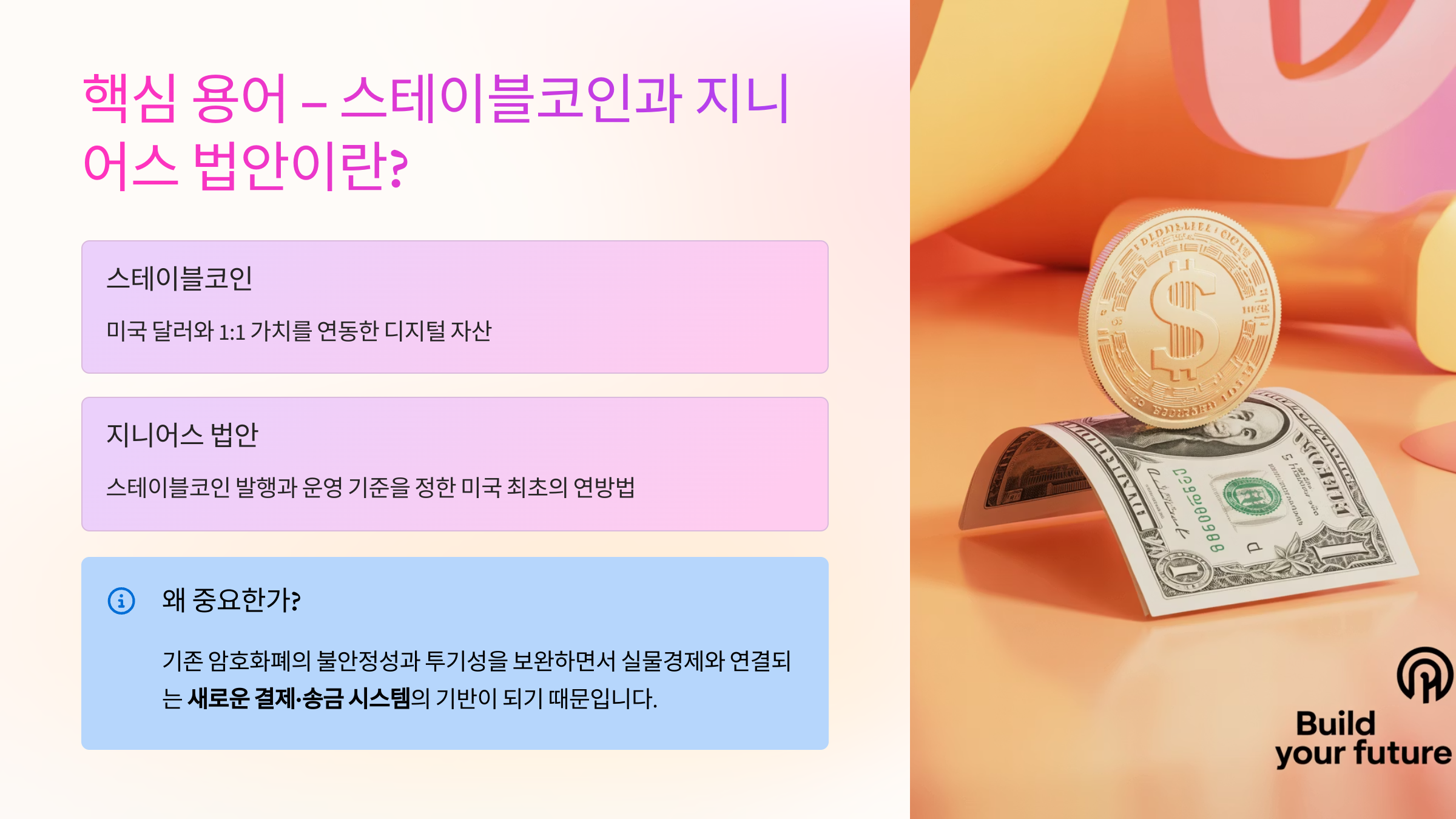 🔹 2. 핵심 용어 – 스테이블코인과 지니어스 법안이란?