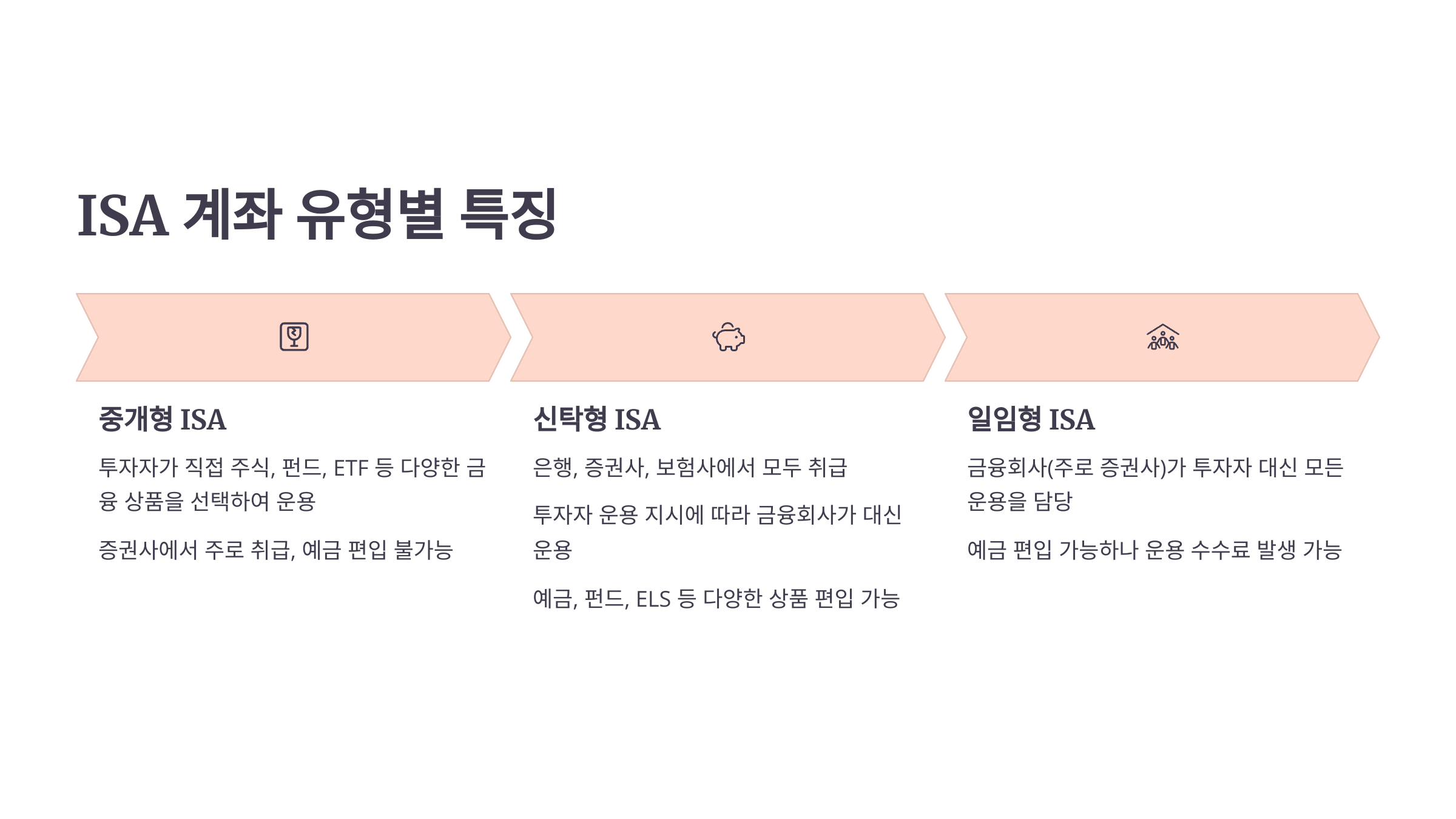 ISA 계좌는 투자자의 성향에 따라 크게 세 가지 유형으로 나뉩니다. 이 중 예금(정기예금, 적금 등) 편입 시 가장 큰 이점을 누릴 수 있는 유형을 선택하는 것이 중요합니다.