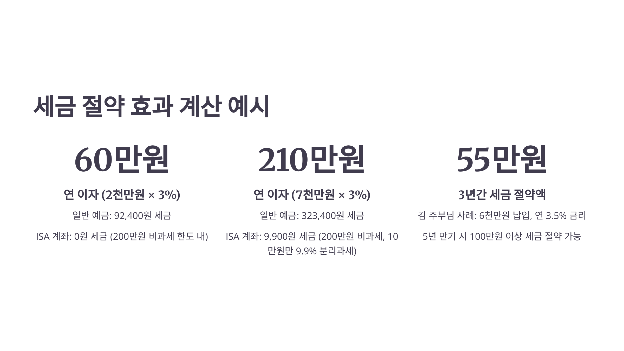 - 연 2,000만 원 납입 시: 연 이자 60만 원 (200만원 비과세 한도 내) → 세금 0원! (일반 예금 시 60만원 * 15.4% = 92,400원 세금 발생)