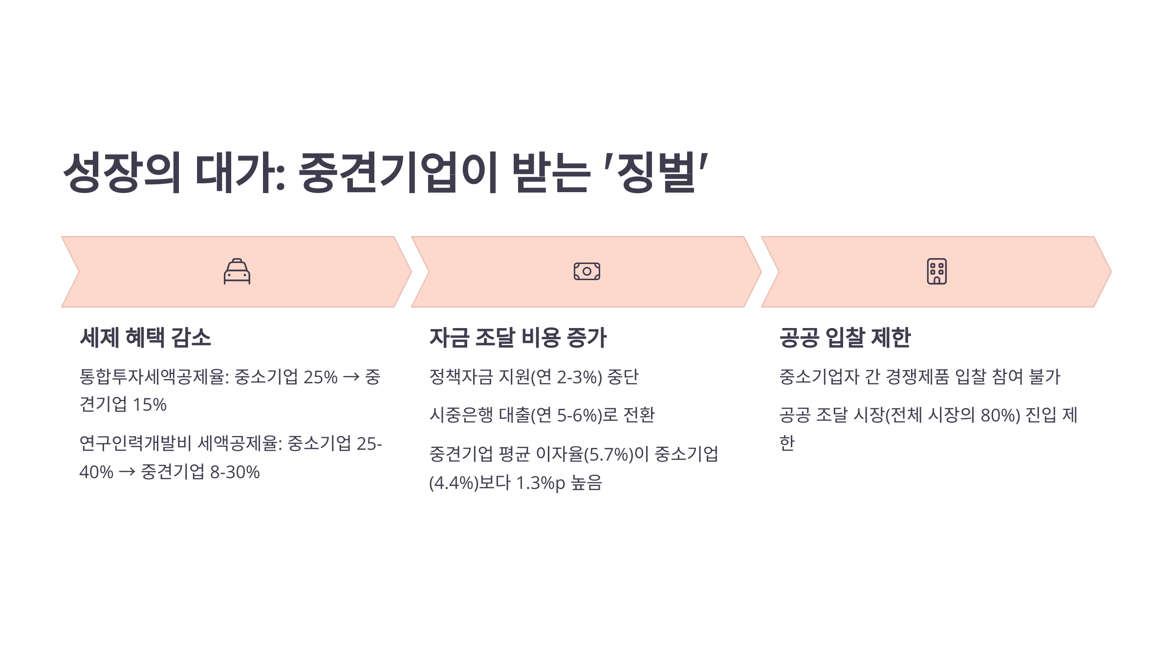 - 지향 방향: 중견기업에 대한 '역차별' 해소, 성장 유인 강화.
